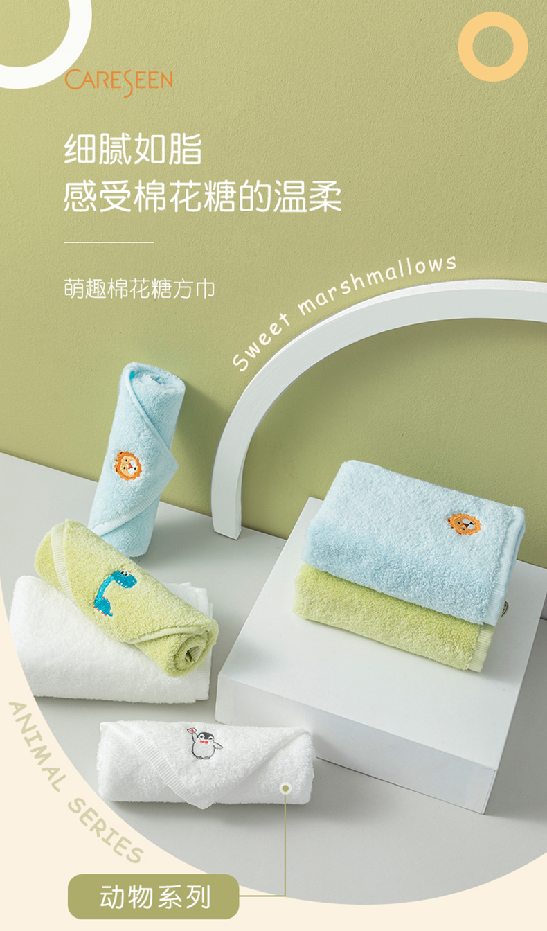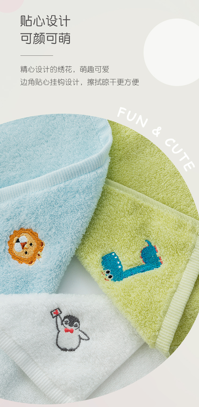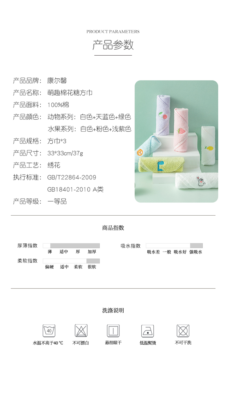 商品名称:康尔馨萌趣棉花糖方巾动物系列3条袋装(单位:袋)天蓝色+绿色+ 白色