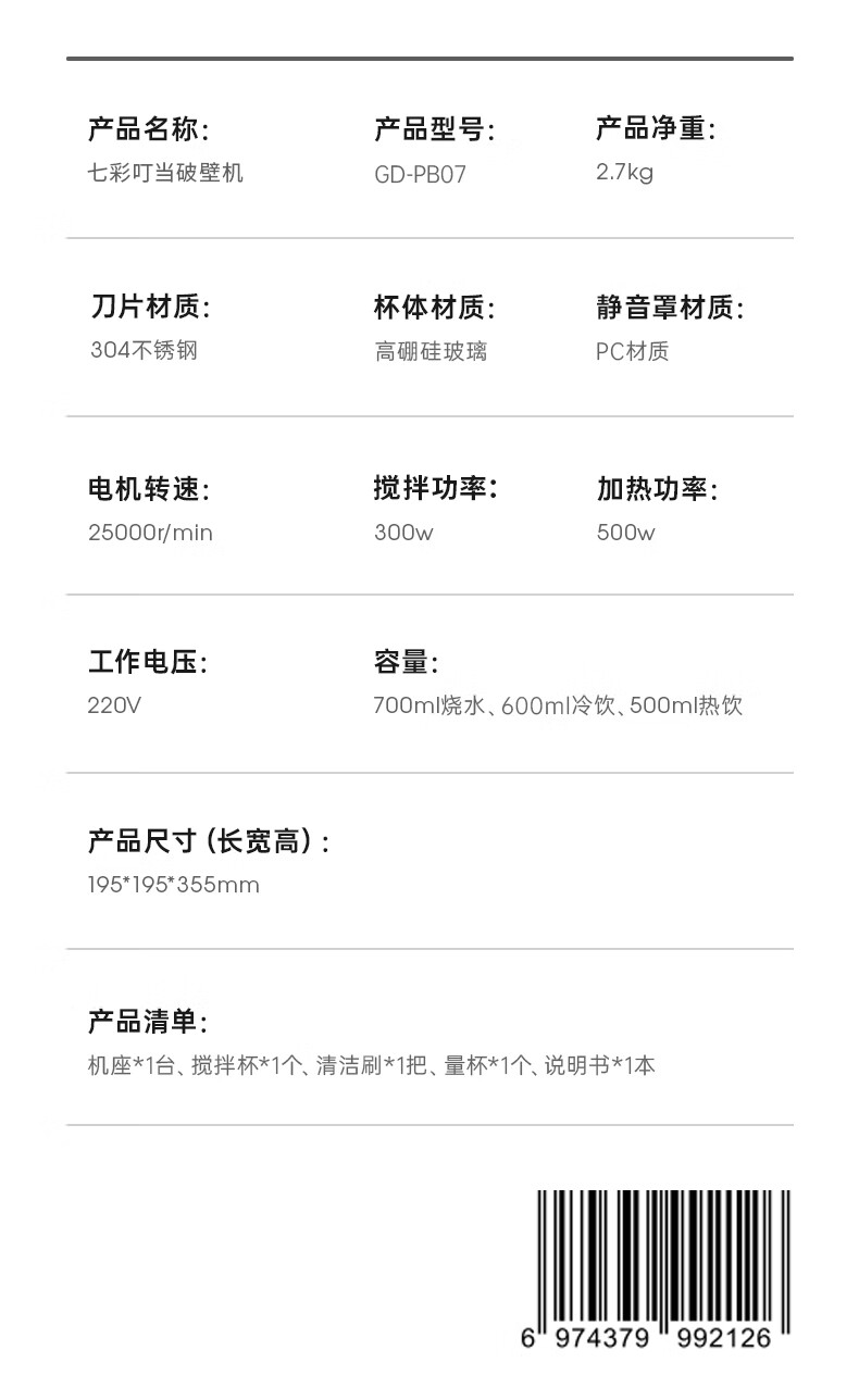商品名称:七彩叮当破壁机GD-PB07 绿色(单位:台) 绿色
