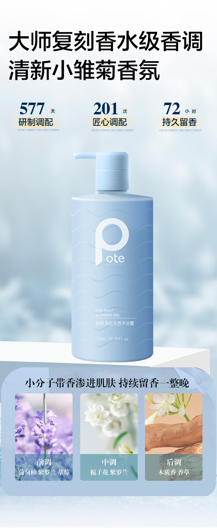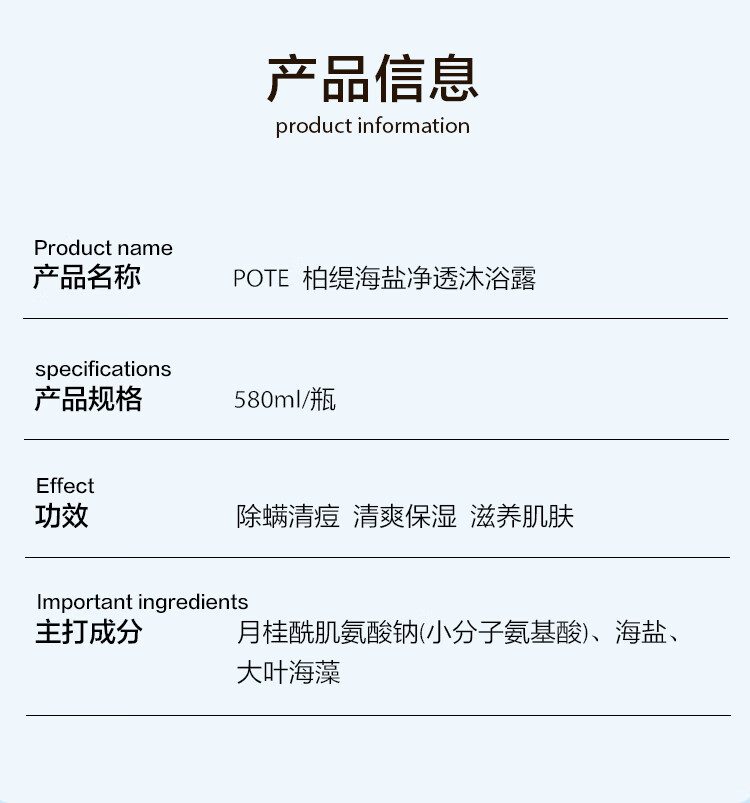 商品名称:柏缇(POTE)海盐净透沐浴露580ml(单位:瓶) 天蓝色
