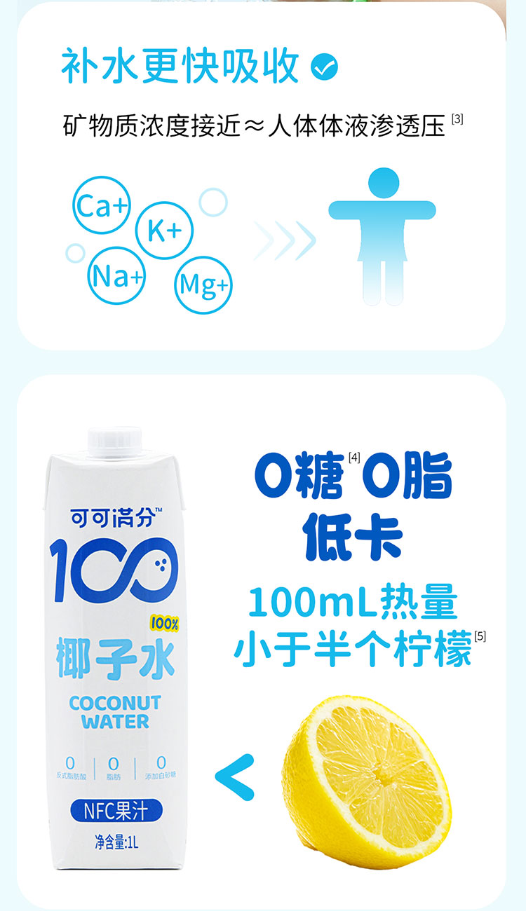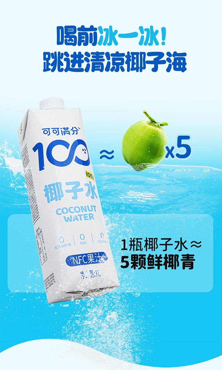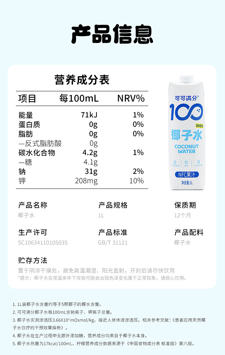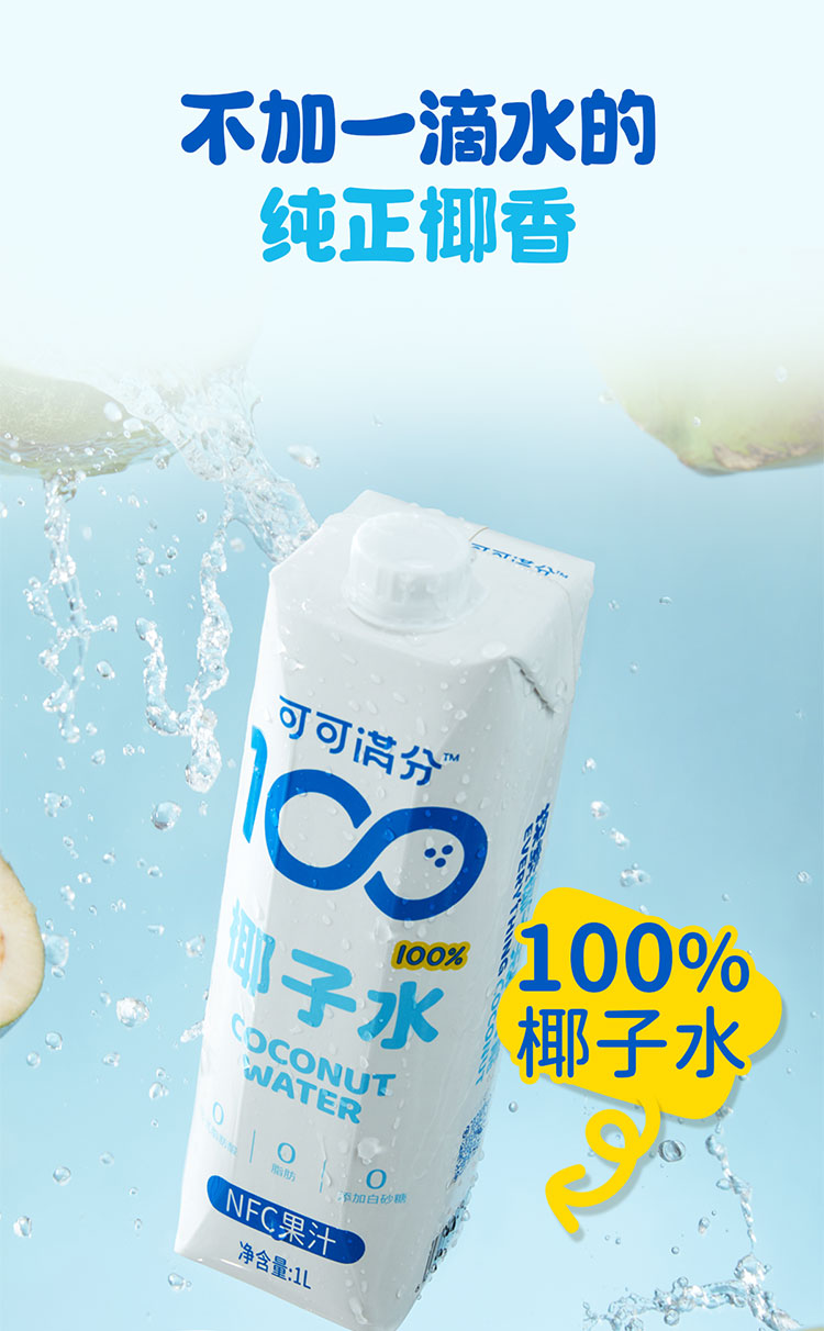 商品名称:可可满分100%椰子水NFC新鲜纯椰青汁含电解质运动补水无添加1L*1瓶 蓝色