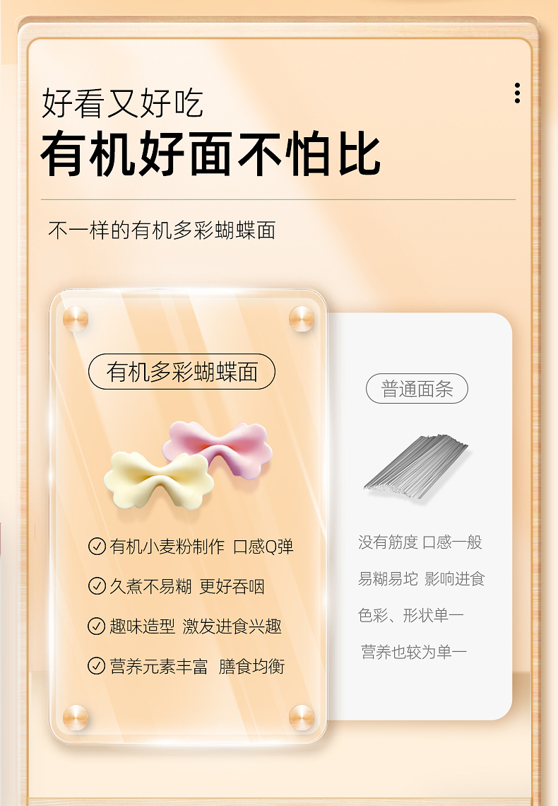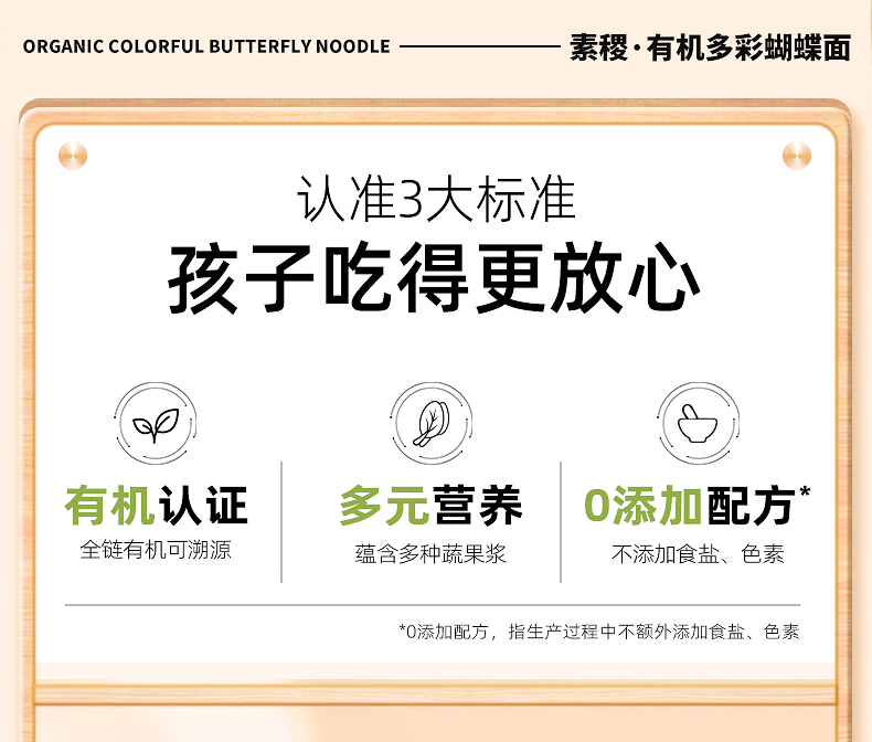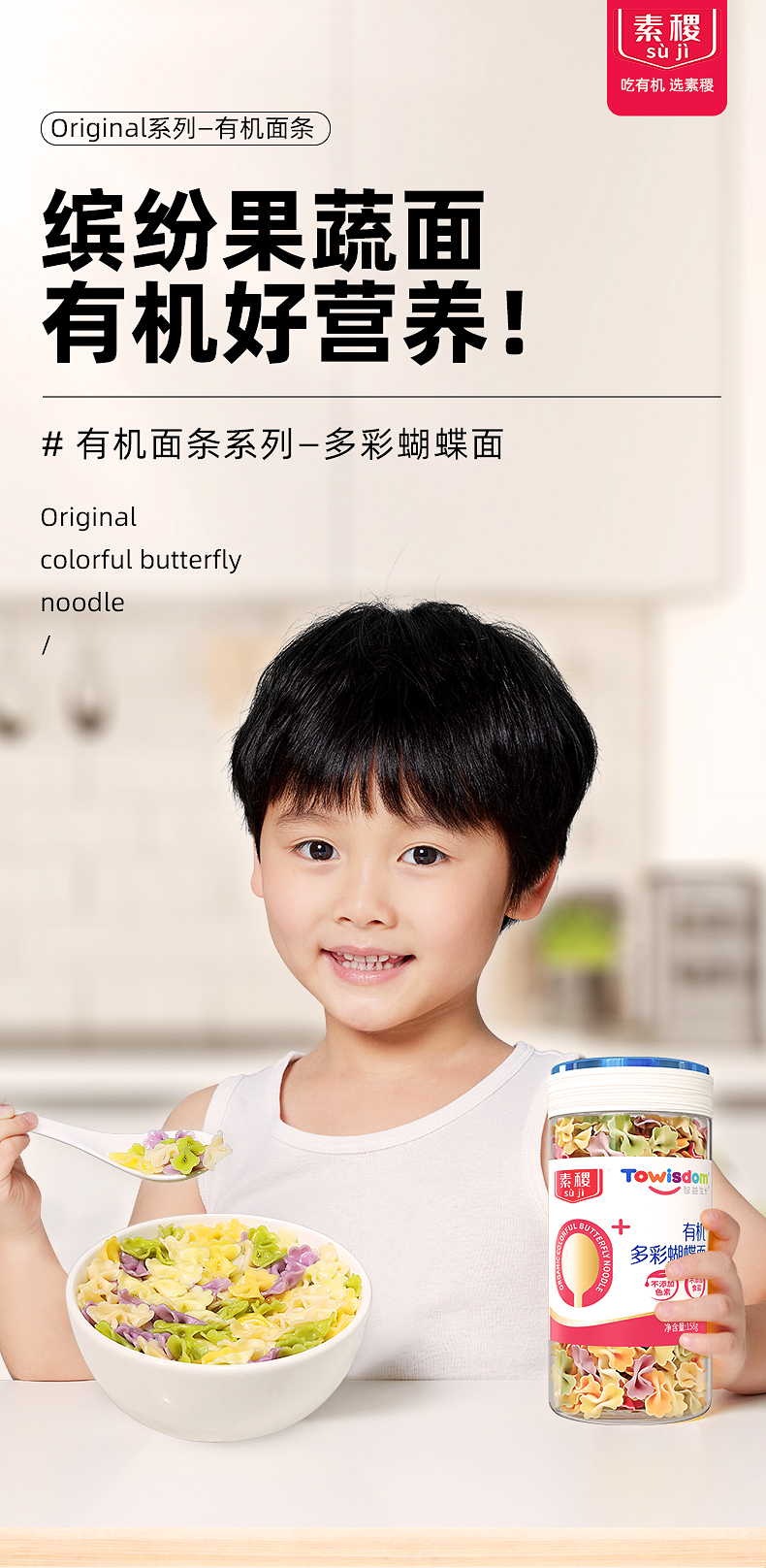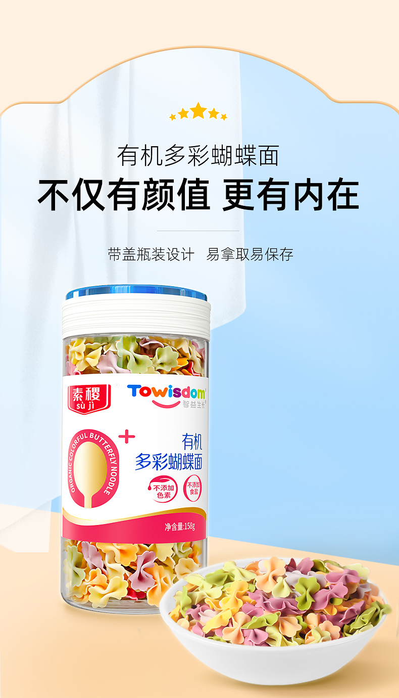 商品名称:素稷(SUJI)有机多彩蝴蝶面儿童营养果蔬面营养健康儿童辅食 有机多彩蝴蝶面158g(瓶装) 佳人粉