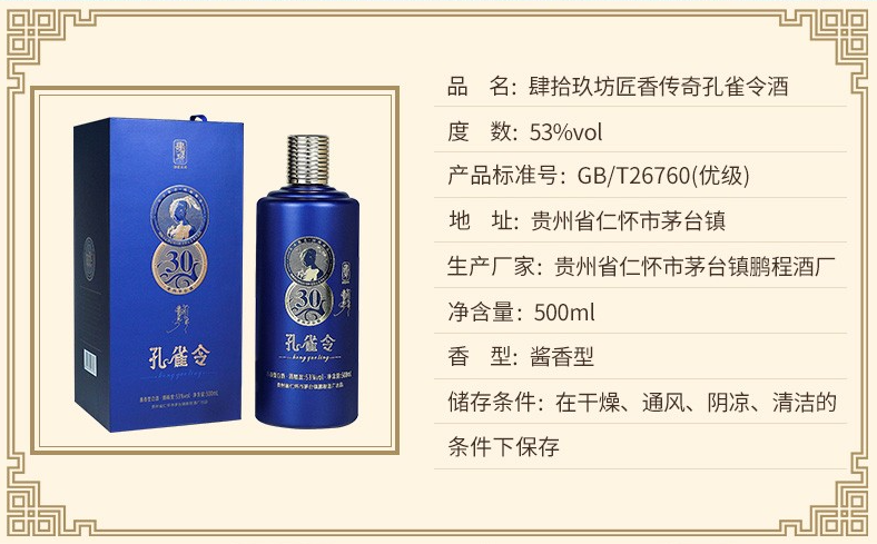 商品名称:肆拾玖坊孔雀令53度酱香型白酒 500mL (单位:瓶) 孔雀蓝