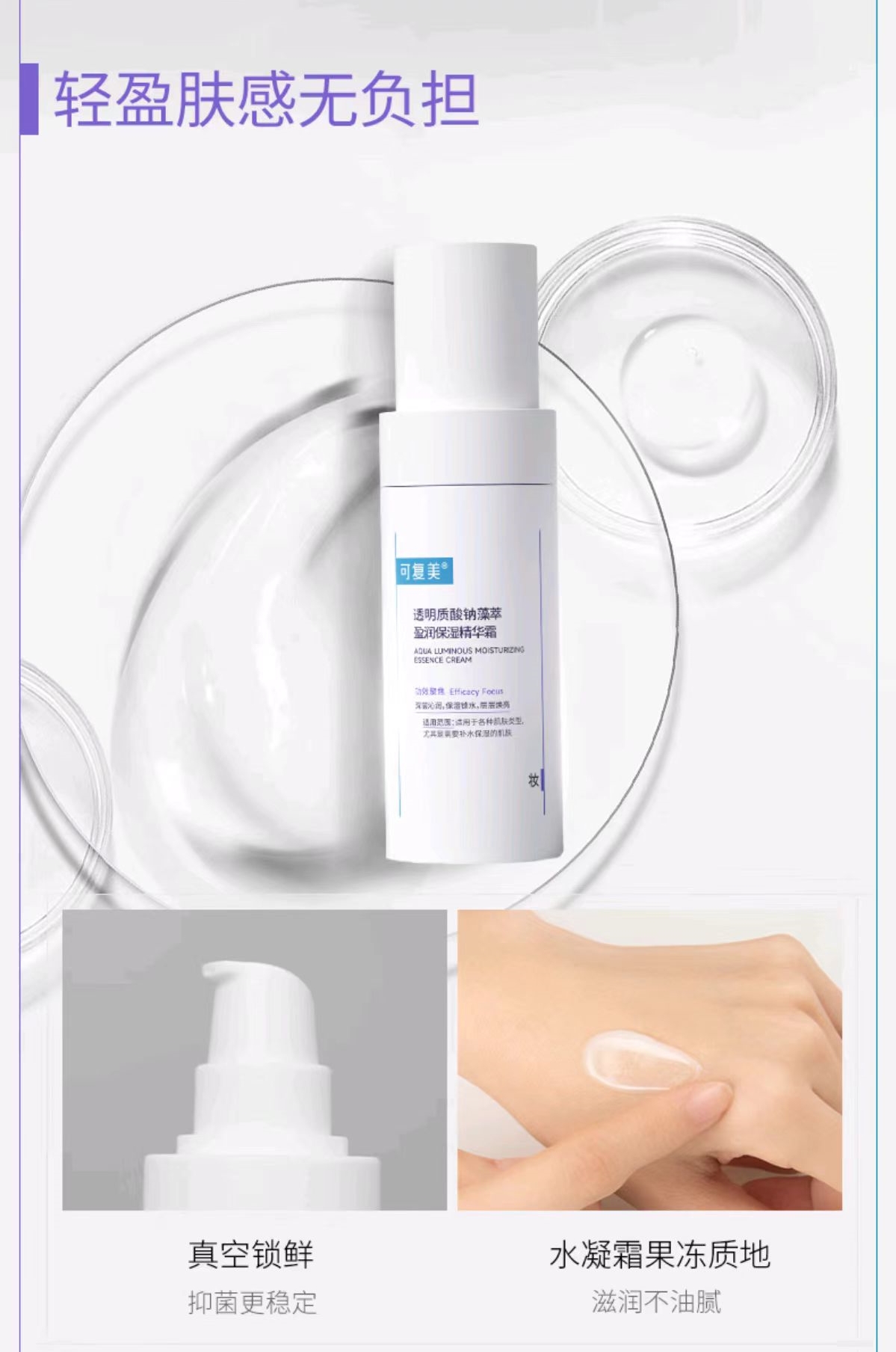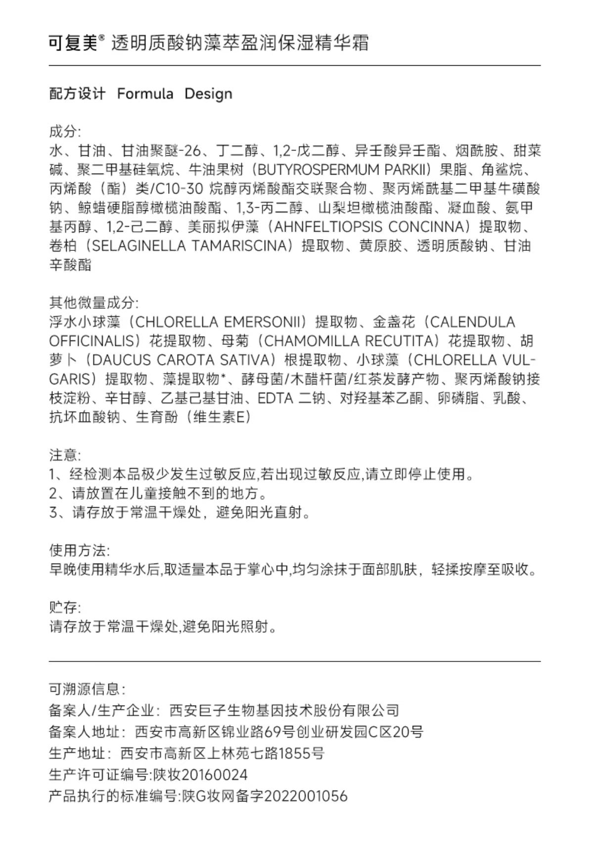 商品名称:可复美透明质酸钠藻萃盈润保湿精华霜50g(单位:瓶)