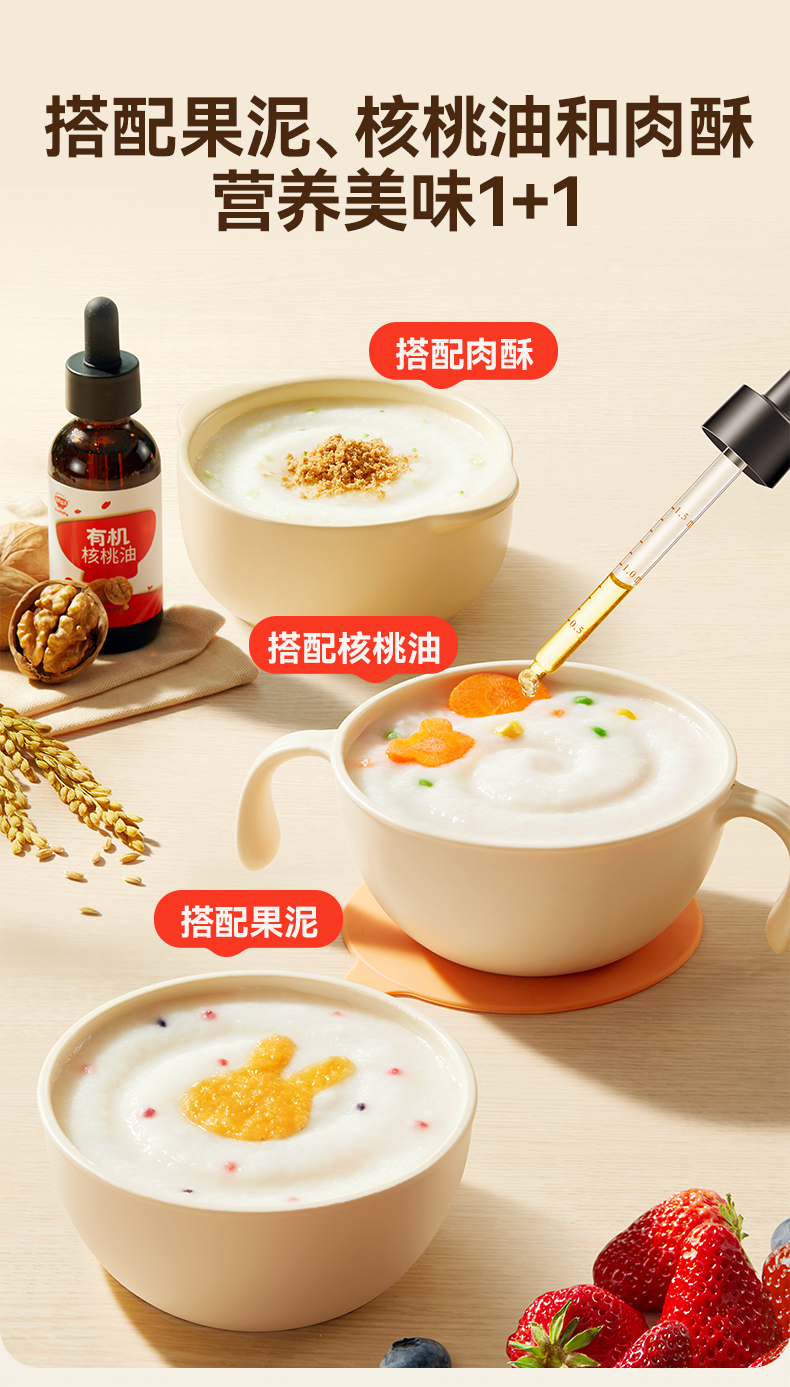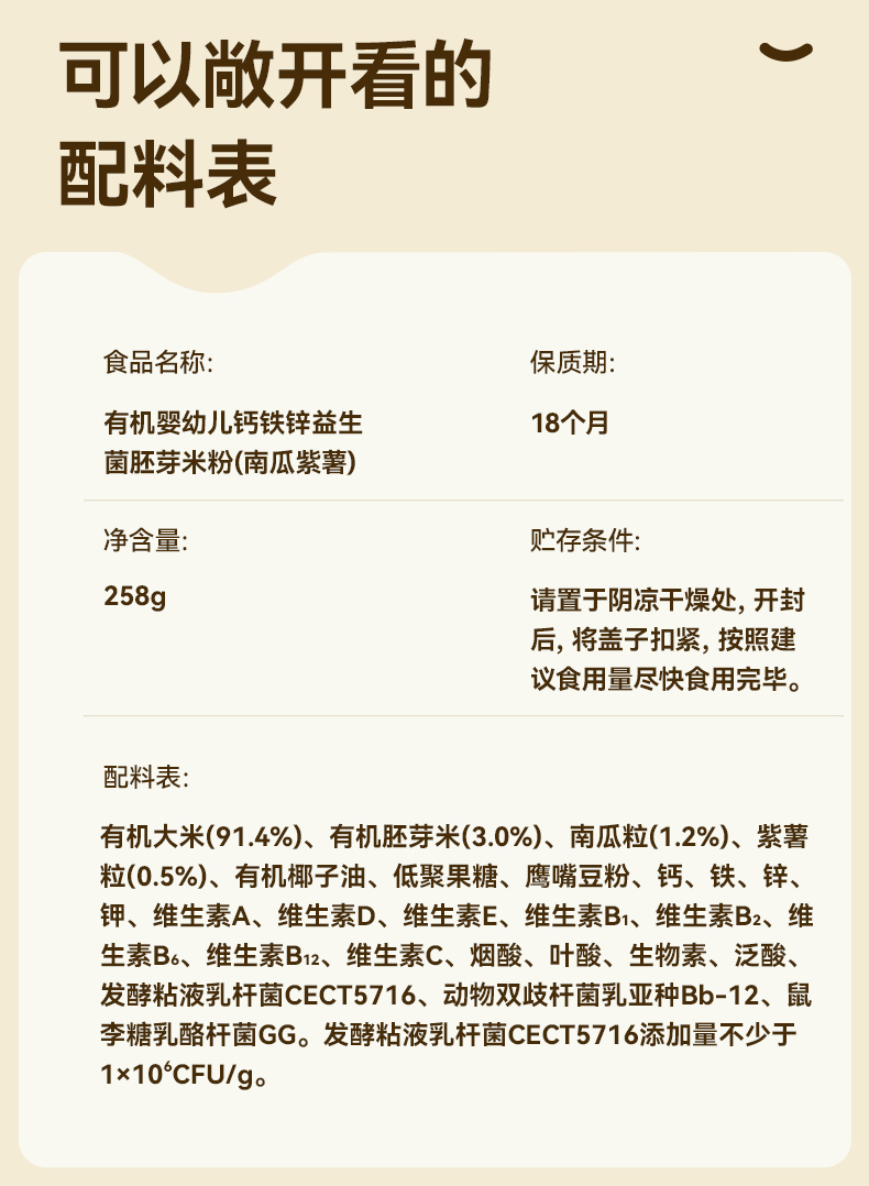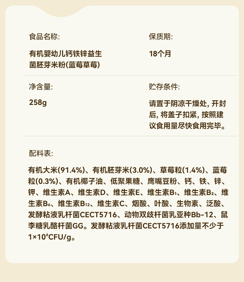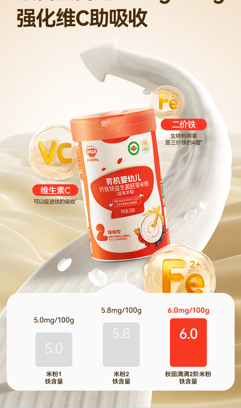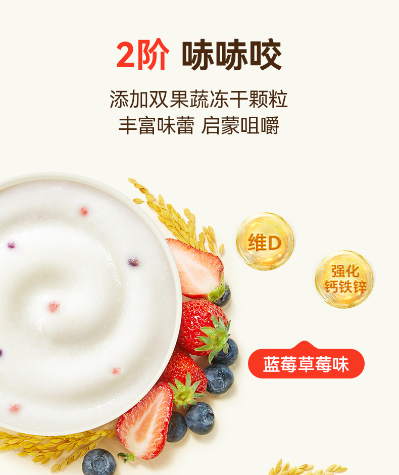 商品名称:秋田满满有机婴幼儿钙铁锌益生菌米粉(蓝莓草莓)258g贝因美*1罐 自然色