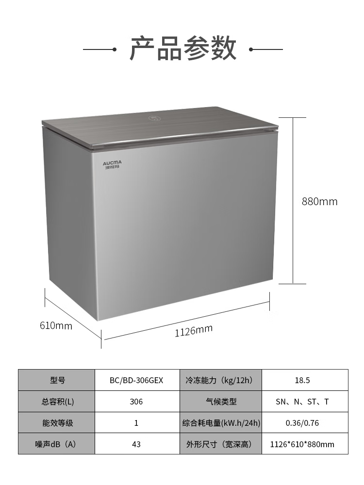 商品名称:澳柯玛(AUCMA)306升小型家用冰柜阻霜冷柜家用BC/BD-306GEX(单位:台) 灰色