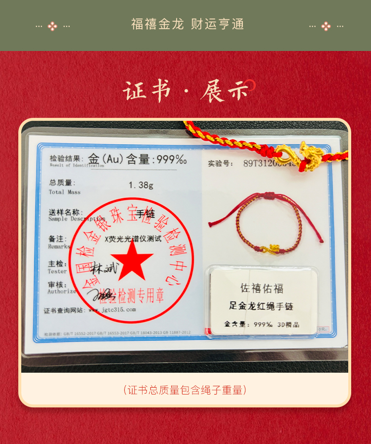 商品名称:佐禧佑福龙年手绳转运珠黄金首饰送礼礼物(红绳黑绳随机发货)单位:件 红绳黑绳随机发货