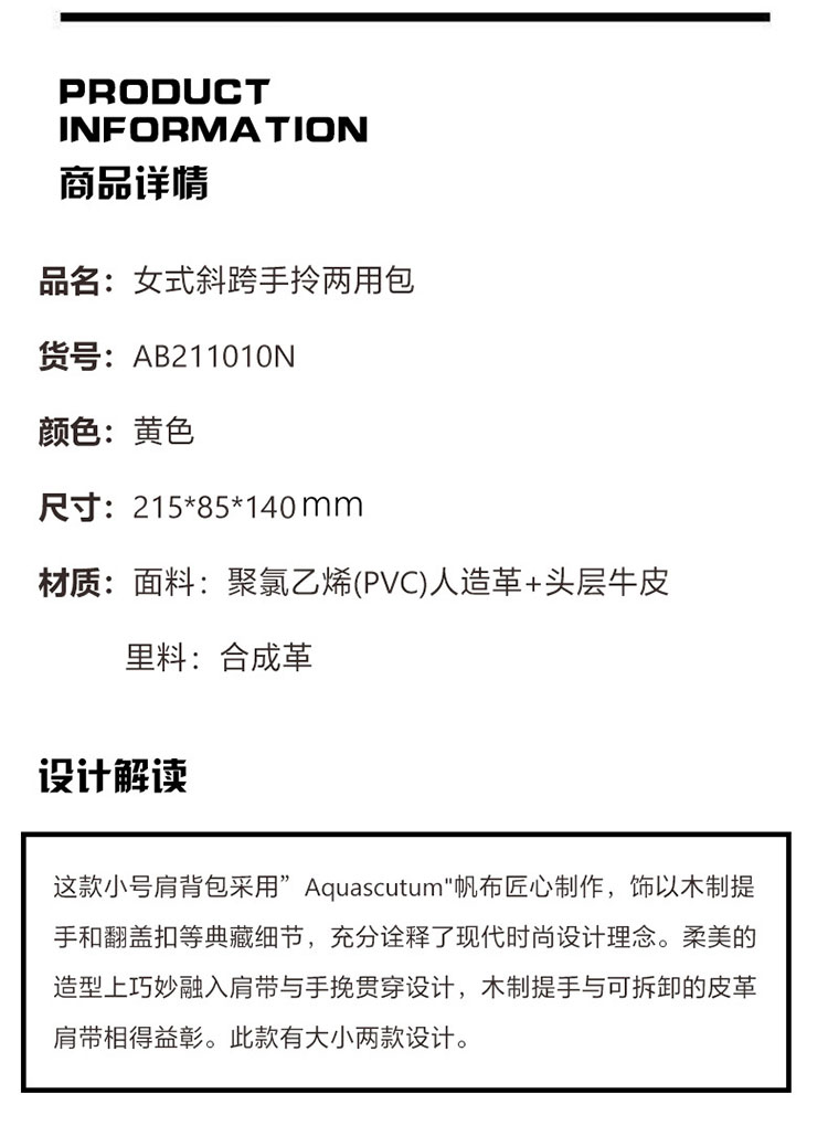 商品名称:Aquascutum雅格狮丹 新款高级感百搭印花单肩斜挎包女 AB211010N 单位:个 黄色