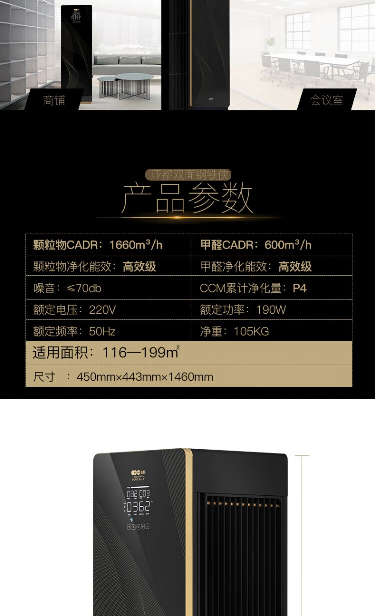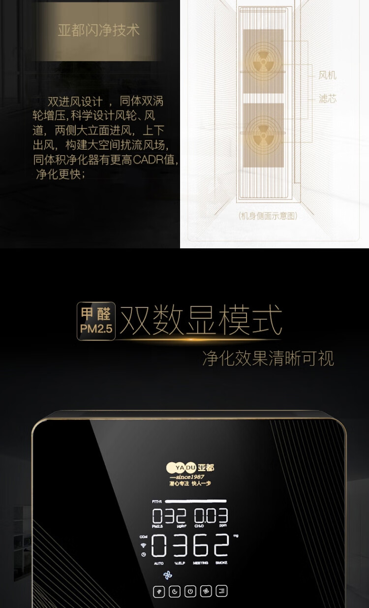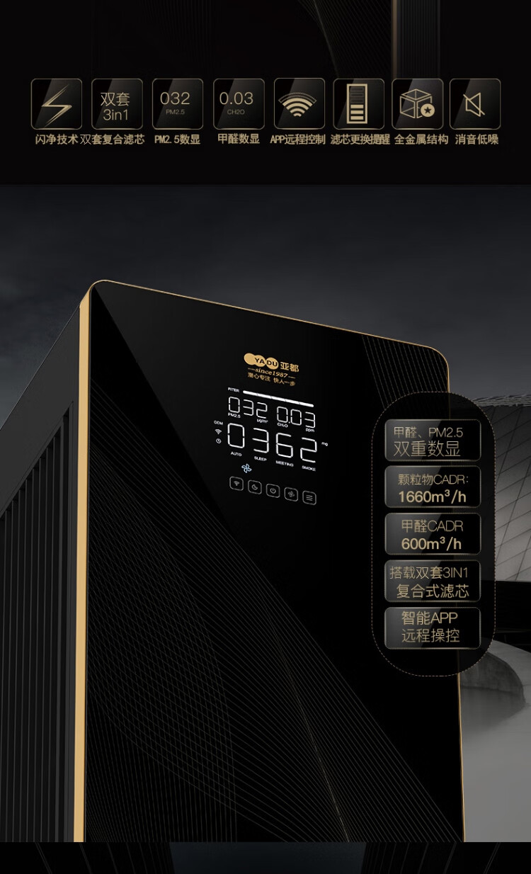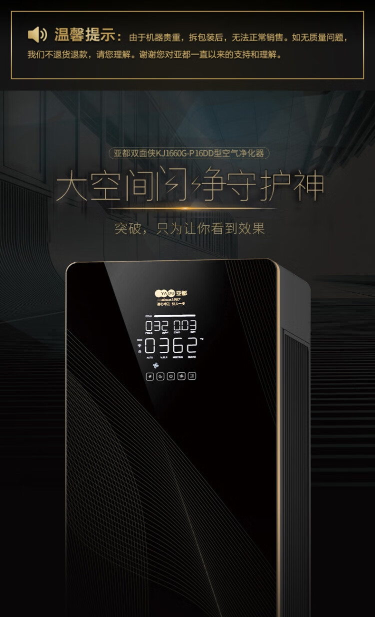 商品名称:亚都空气净化器 办公室家用除甲醛 除雾霾闪净技术双数显四面复合滤网KJ1660G-P16DD单位:台 黑色
