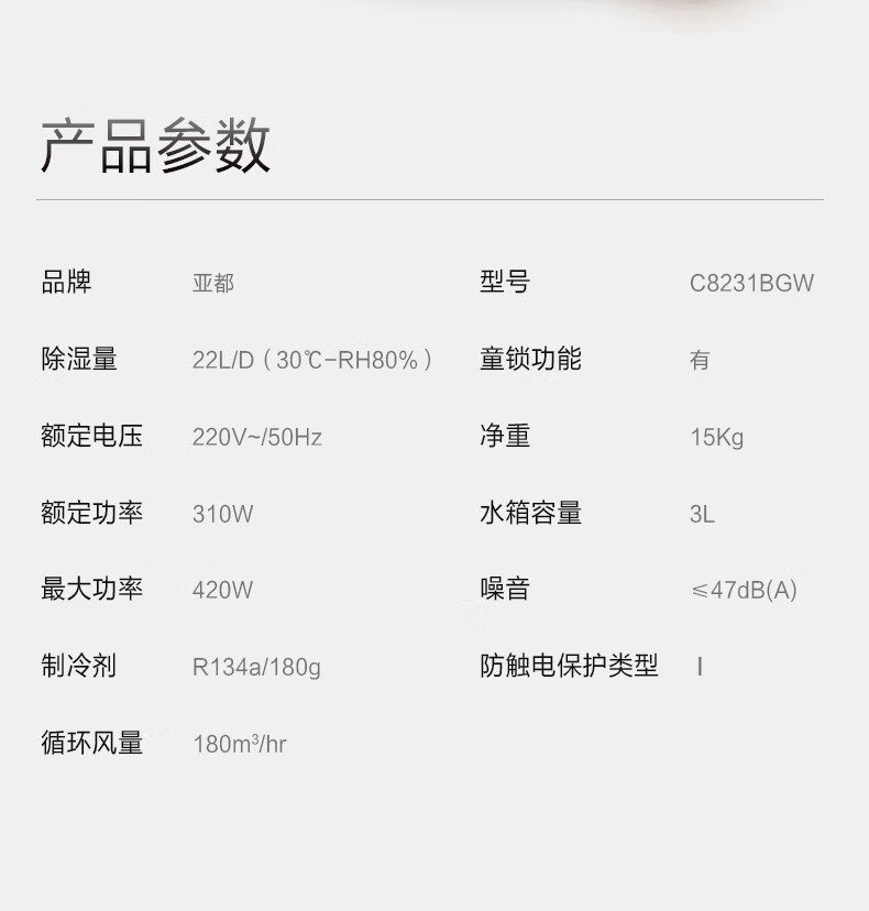 商品名称:亚都(YADU)除湿机 C8231BGW家用除湿器轻音抽湿地下室抽湿器 白色 单位:台 白色
