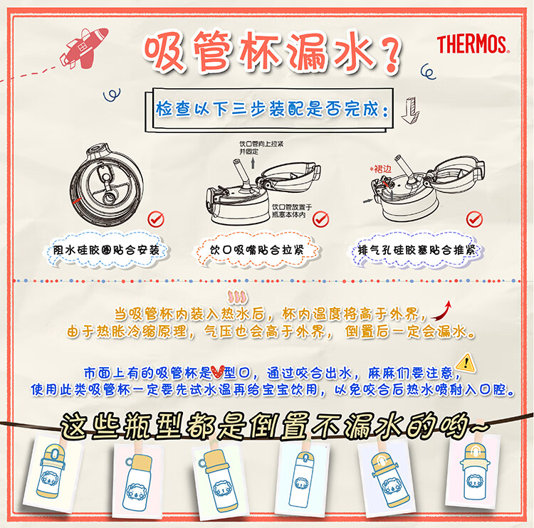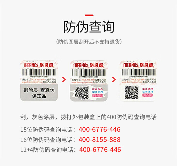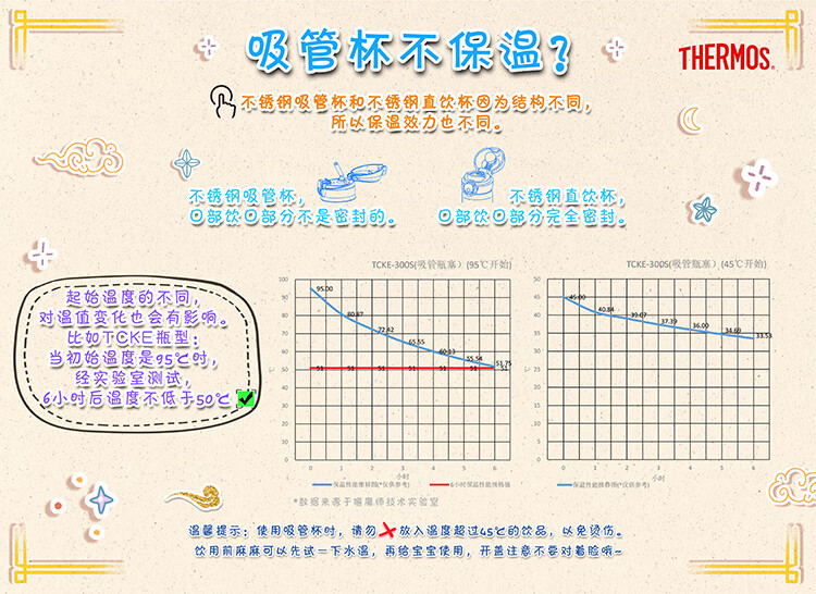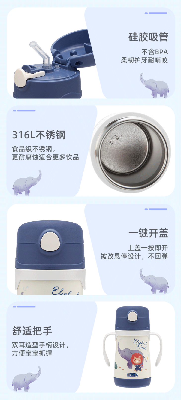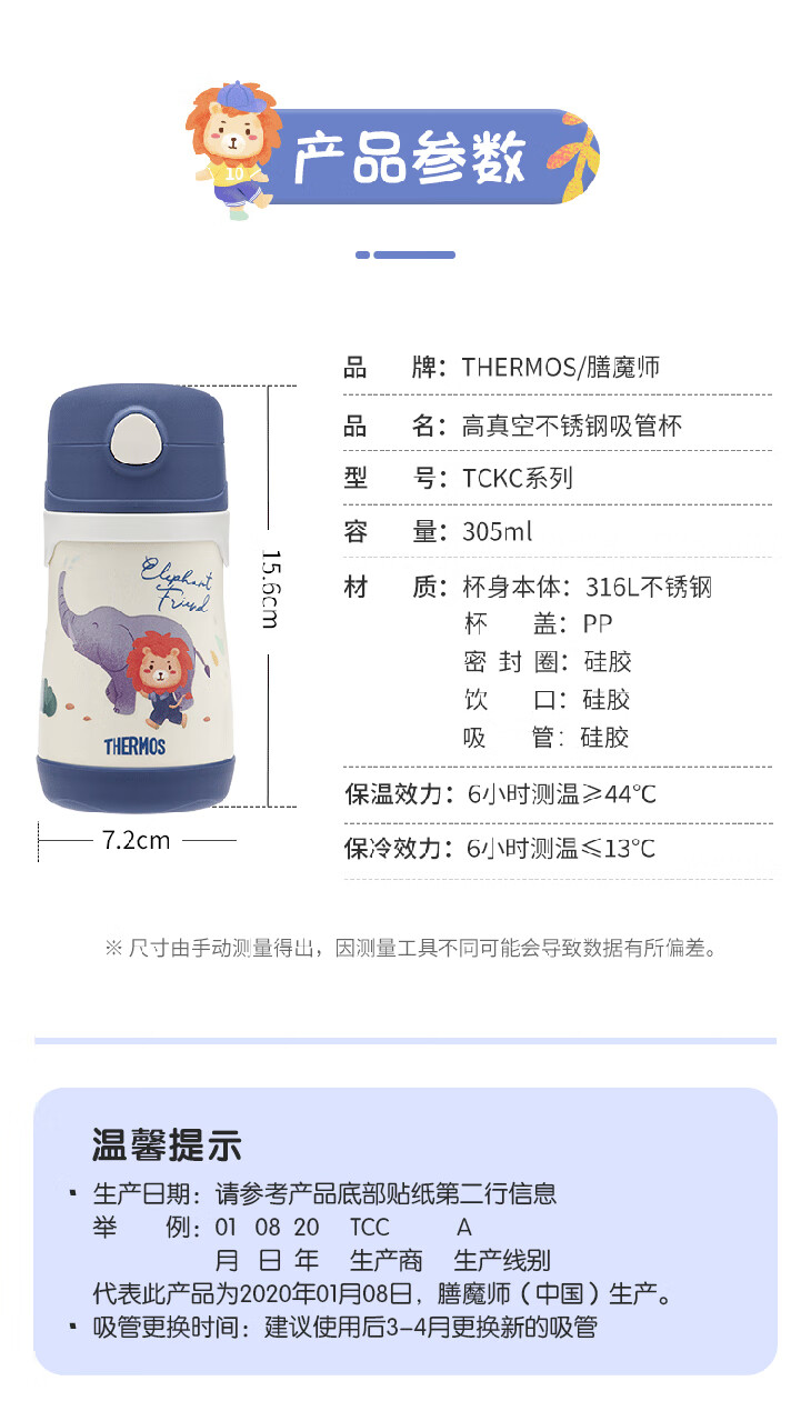 膳魔师高真空儿童不锈钢保温杯农场系列 TCKC-350FS (FM) 颜 色:浅蓝粉、黄色(小羊:6926497339970;奶牛: 6926497339987) 容 量:305ml 产品材质:高级304不锈钢 装箱数量:12/pcs 6.8*6.8*17CM 。 产品简介: --采用不含BPA的不锈钢材质制成,此款Thermos膳魔师保温杯具备最先进的不锈钢真空保温保冷技术,具有卓越的保温和保冷功能,可以让你的饮料或水保持的更热,更冷和更新鲜! --耐用性内胆和外壳不用担心会摔坏! --设计独特的吸管式更方便饮用(注“开水时请勿直接饮用以免烫伤,可将水倒出饮用!) --先进的防漏技术绝对不会打翻或漏出杯子里的液体 --305ml的体积,不大不小。 --膳魔师的动物系列专为宝宝设计,冬天保温,夏季保冷。不管您在哪里,膳魔师都是你宝宝的贴心小伙伴。 --防漏,并易于清洁* --吸管设计,让宝宝吸吮更方便* 。