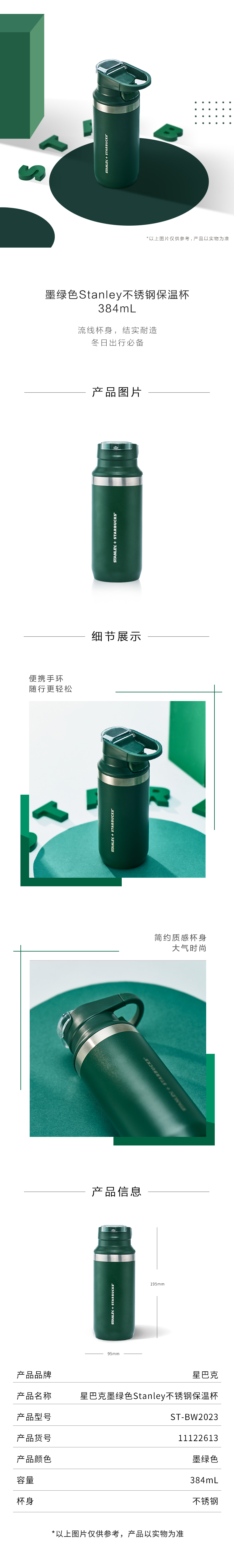 商品名称:星巴克Stanley不锈钢保温杯384ml 11122613/ST-BW2023(单位:个) 墨绿色