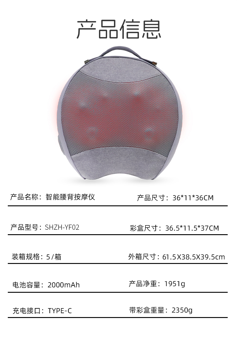 商品名称:上亨 SHZH-YF02 腰部 按摩器 家用智能仿真人揉捏 腰背部多功能红光热敷 单位:台 灰色
