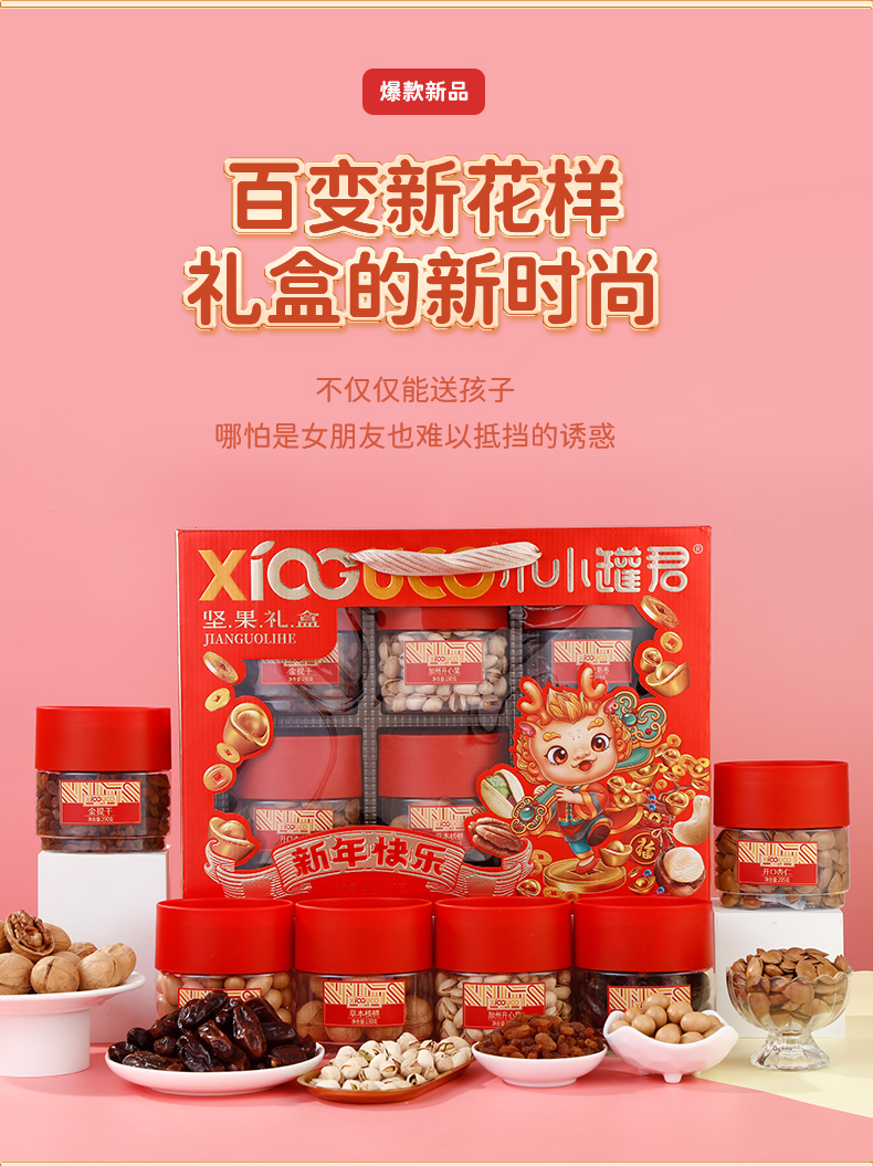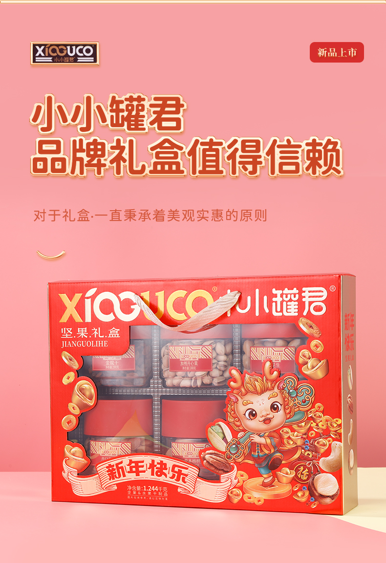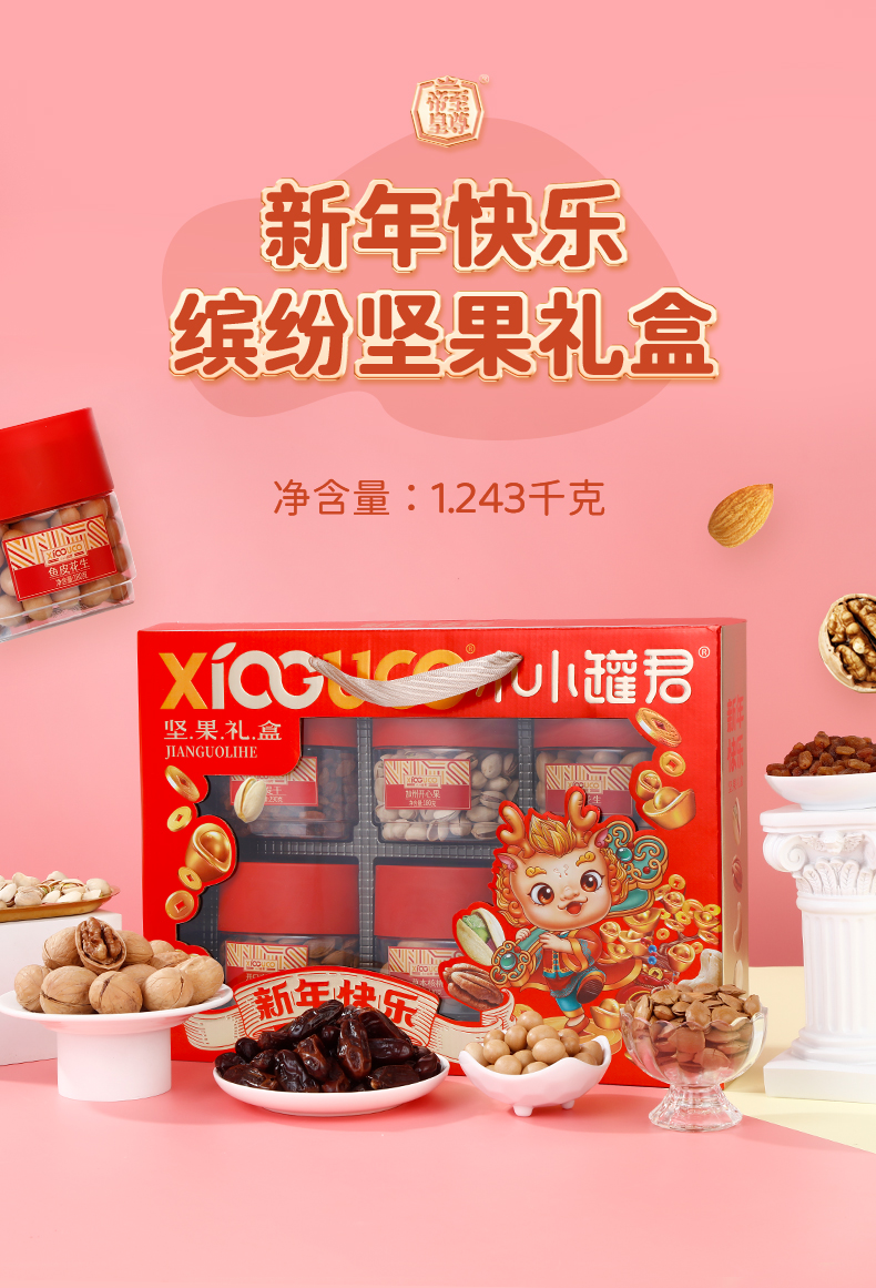商品名称:小小罐君 新年快乐坚果礼盒 1243g*1 单位:盒 新年快乐