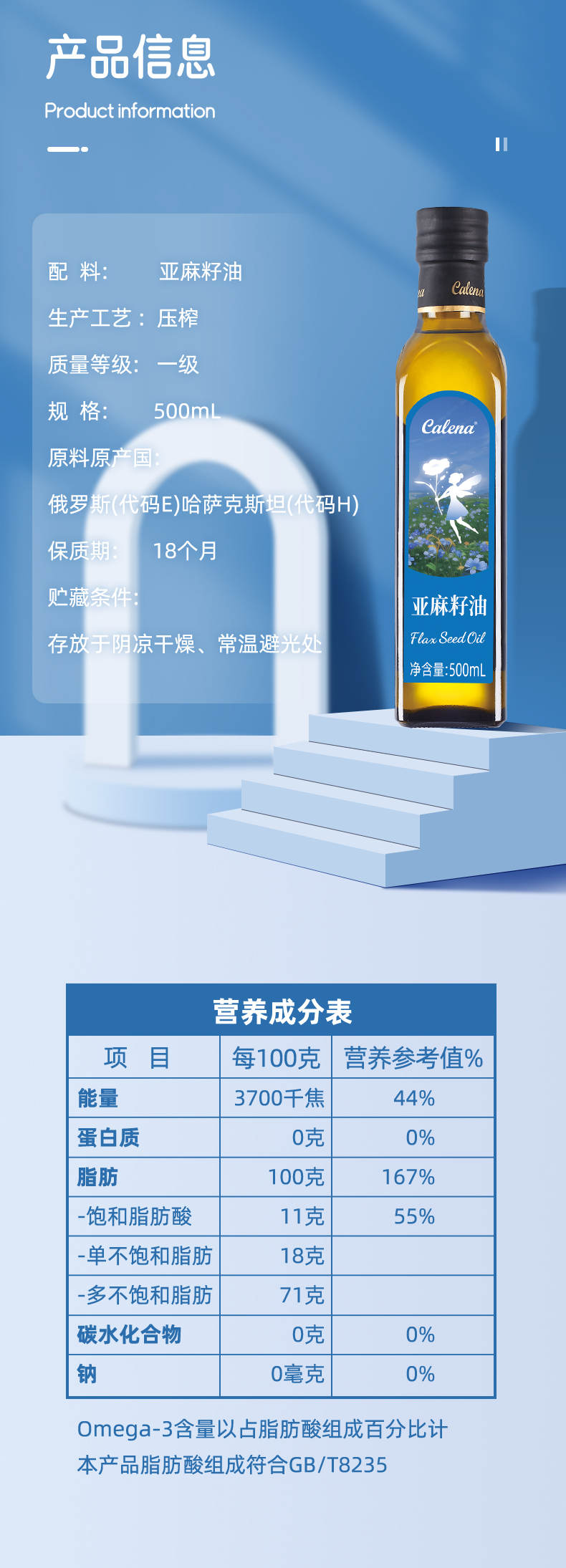 商品名称:克莉娜亚麻籽油500ML 单位:瓶 500ML