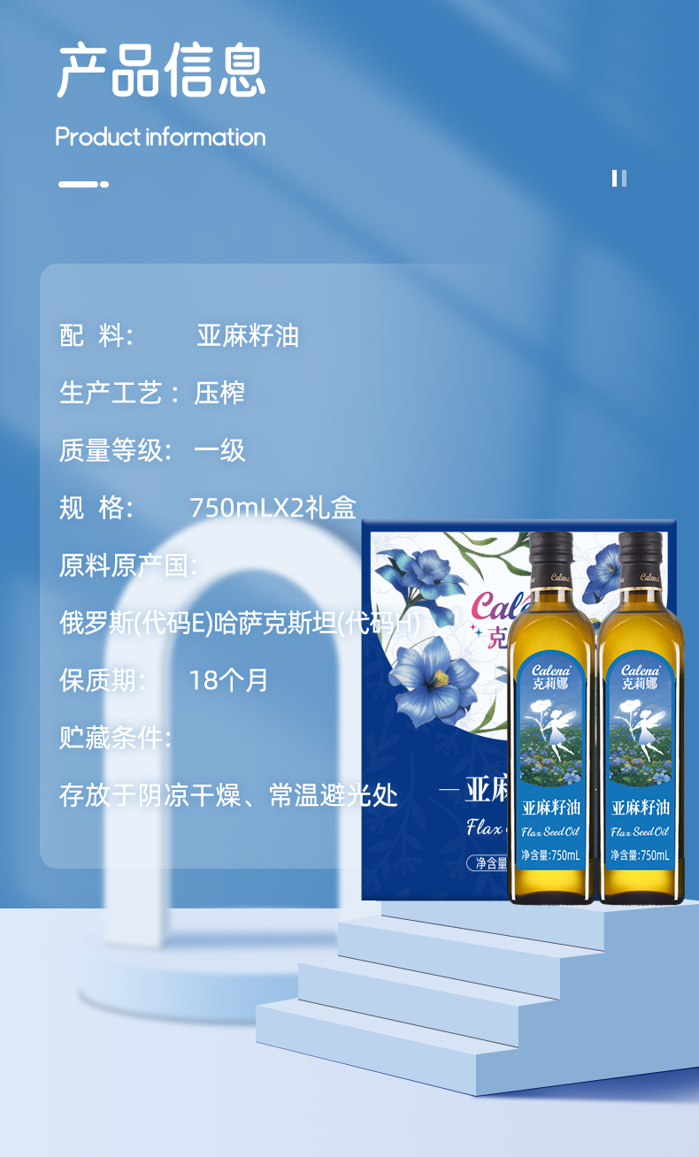 商品名称:克莉娜亚麻籽油750ML*2礼盒 750ML*2礼盒