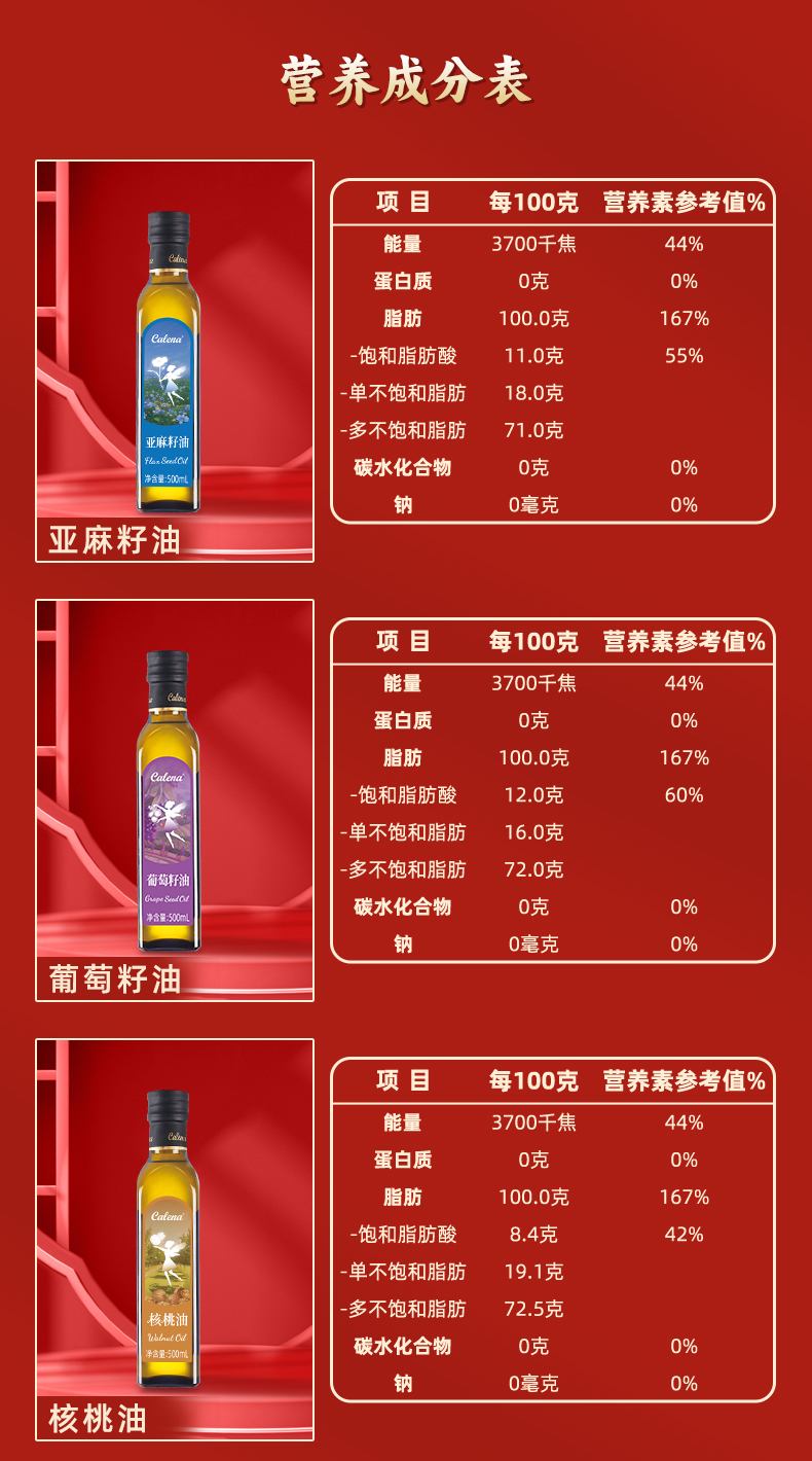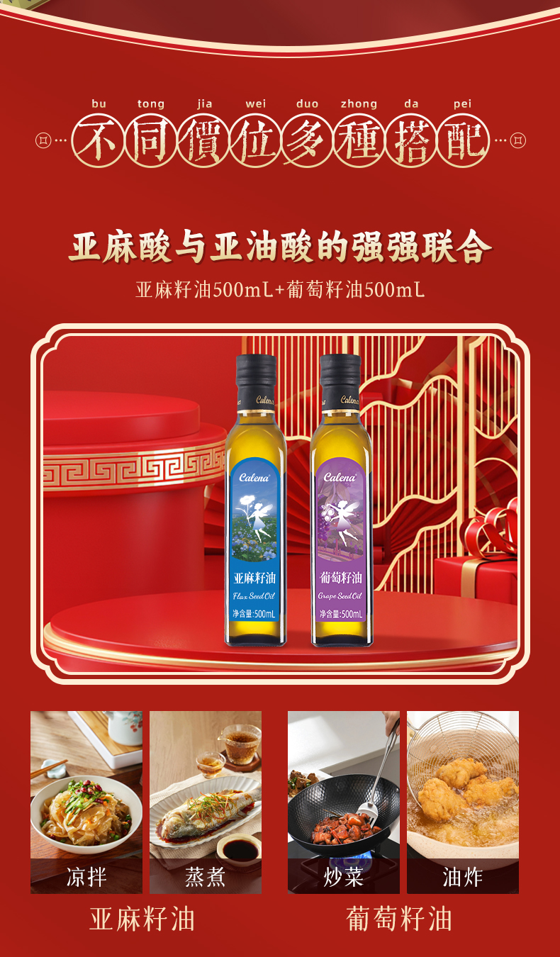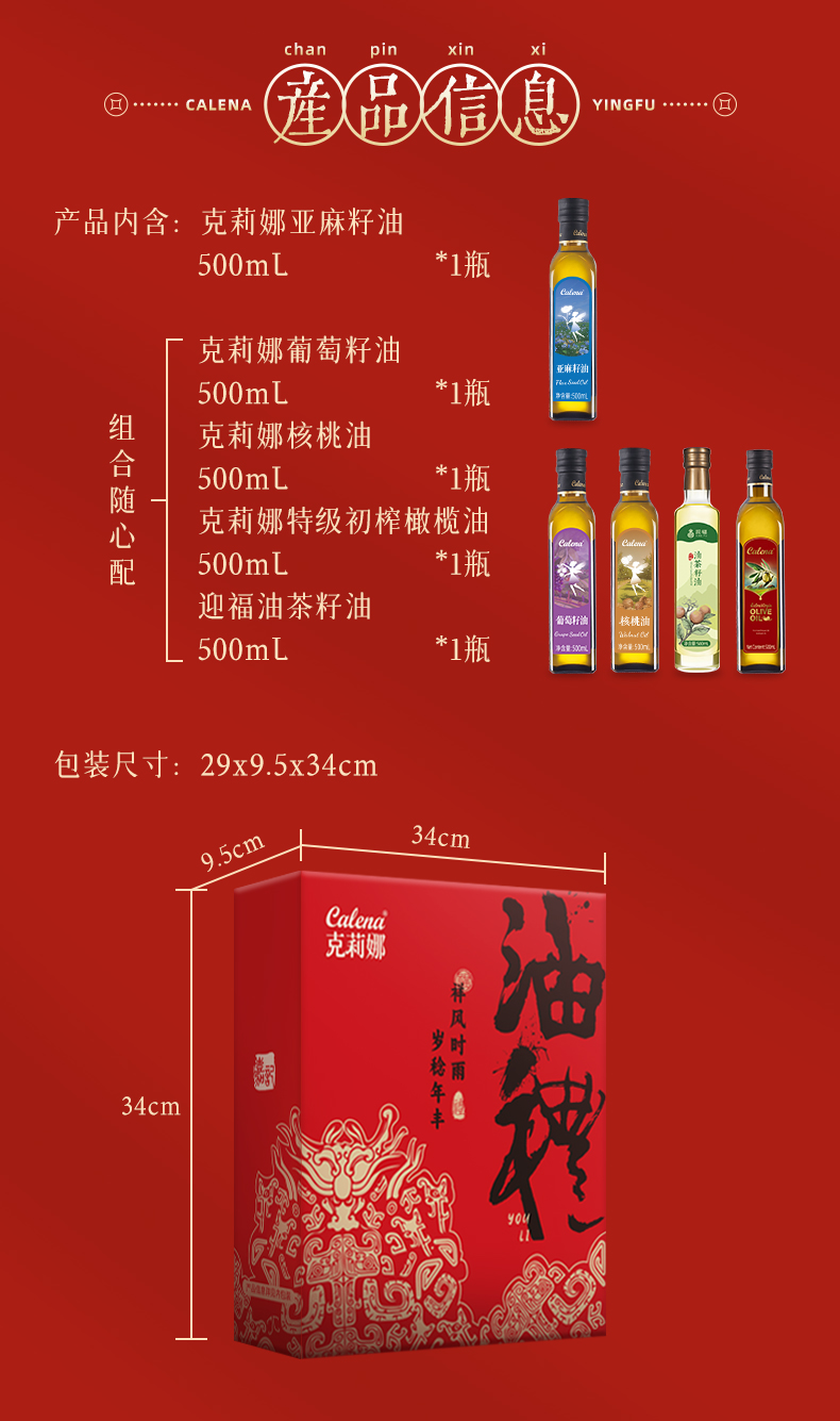 商品名称:克莉娜 新春油礼(亚麻籽油+葡萄籽油/ 500ml*2)(亚麻籽油+葡萄籽油/ 500ml*2) 盒 亚麻籽油+葡萄籽油 500ml*2礼盒