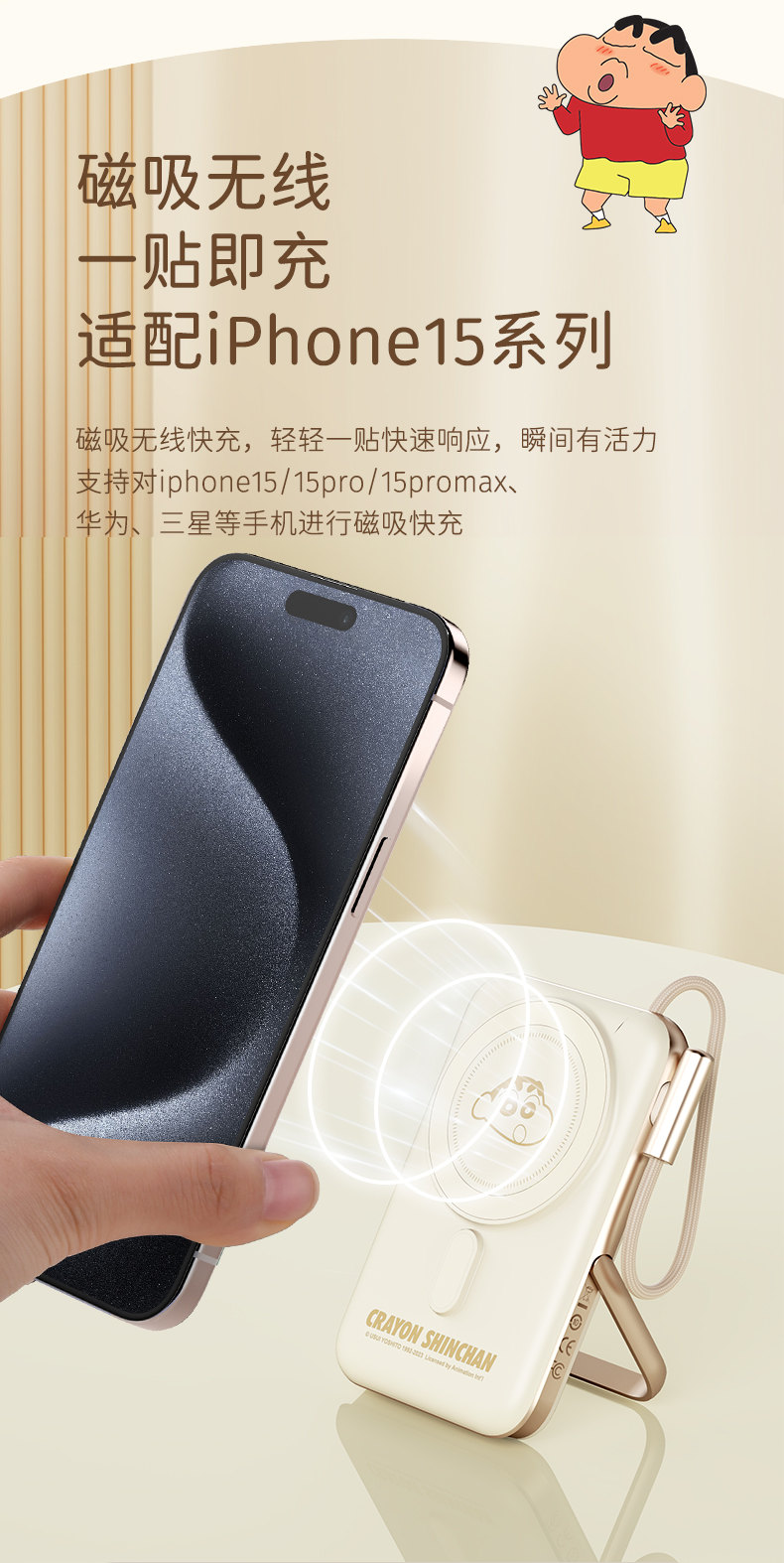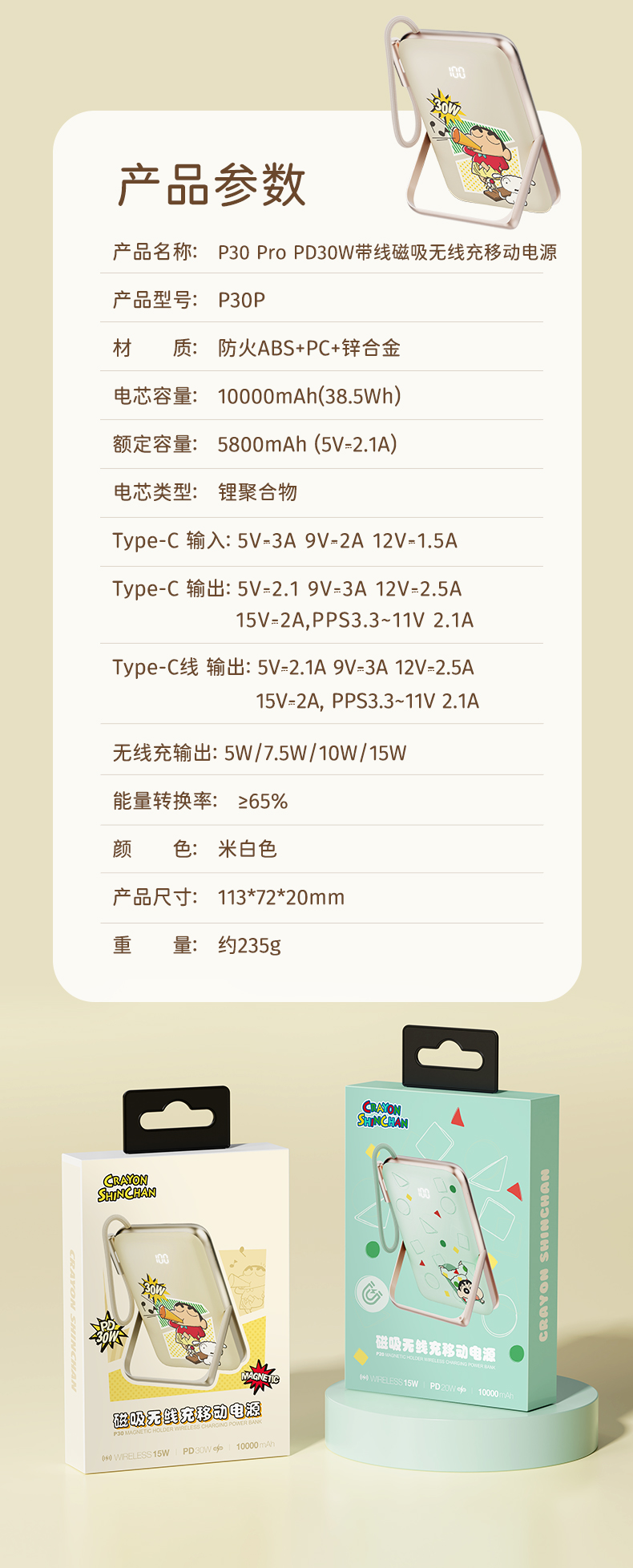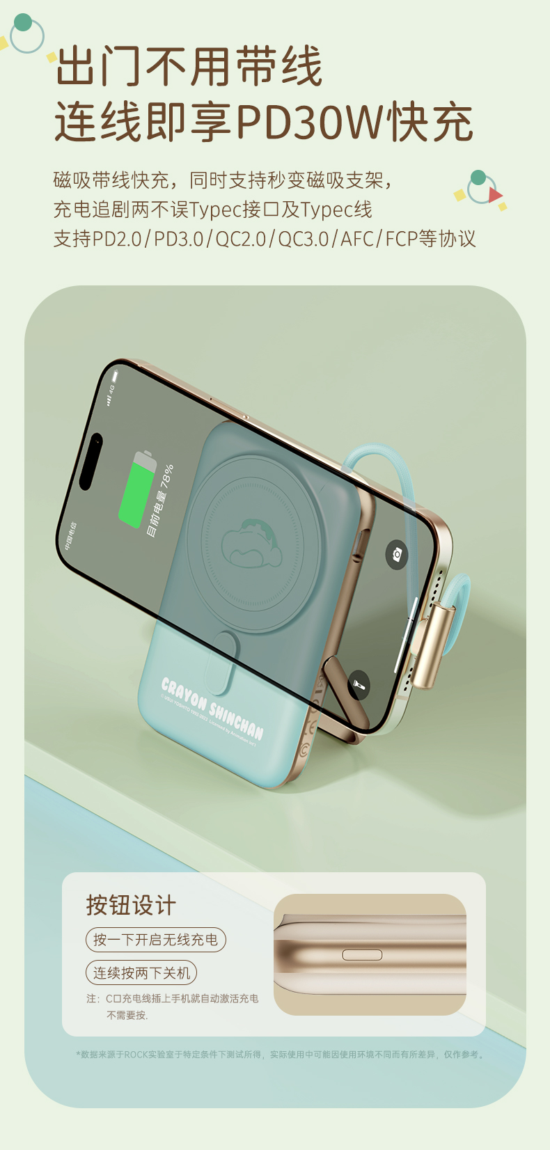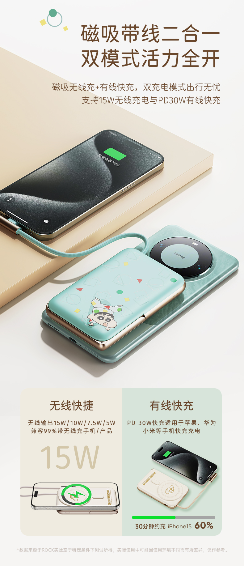 商品名称:ROCK 蜡笔小新 P20/P30Pro PD20W磁吸无线充PD快充移动电源 带线款 单位:个 雅川青