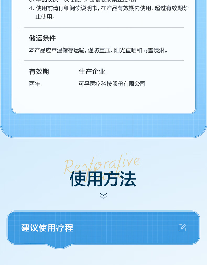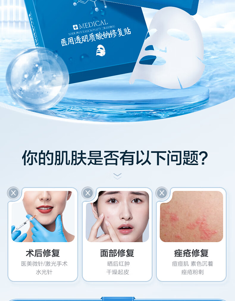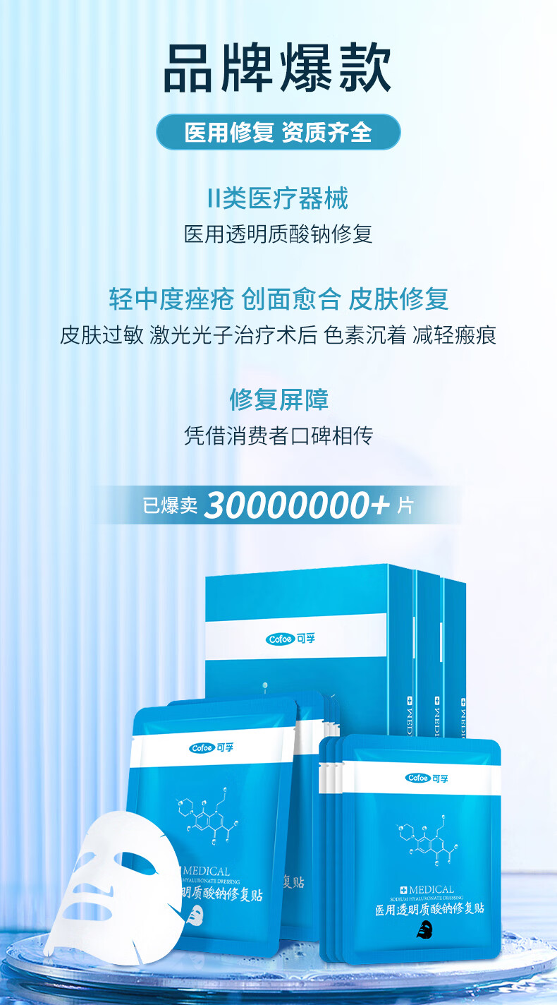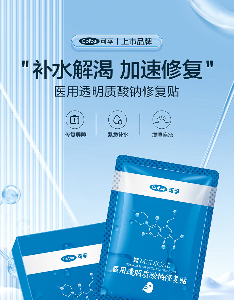 商品名称:可孚医用透明质酸钠修复贴 KF-HT(21cmX24cm)-5片/盒(白膜)