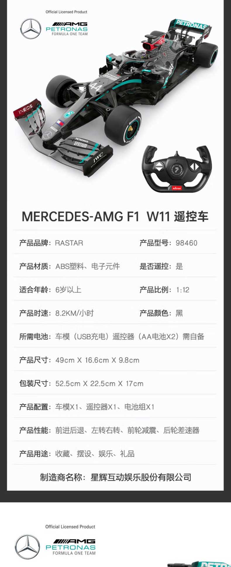 商品名称:rastar 1:12儿童遥控车玩具车F1方程式赛车98460(单位:辆) 黑