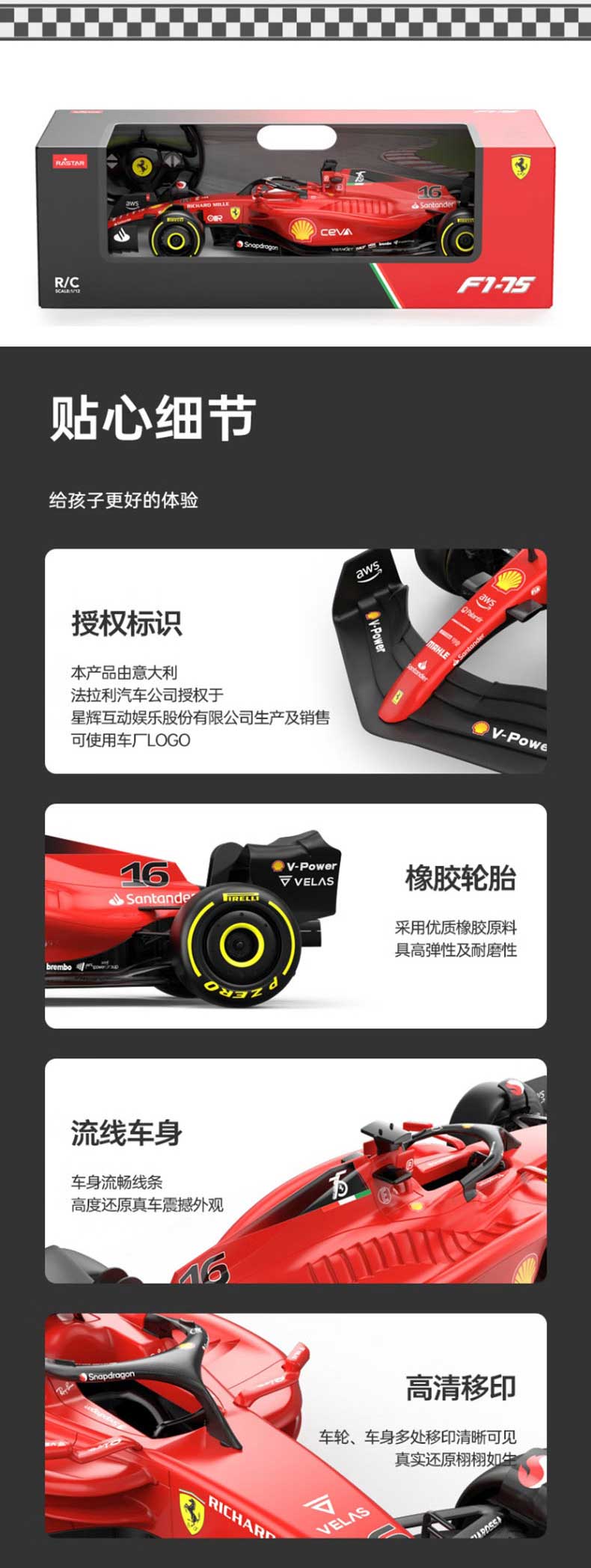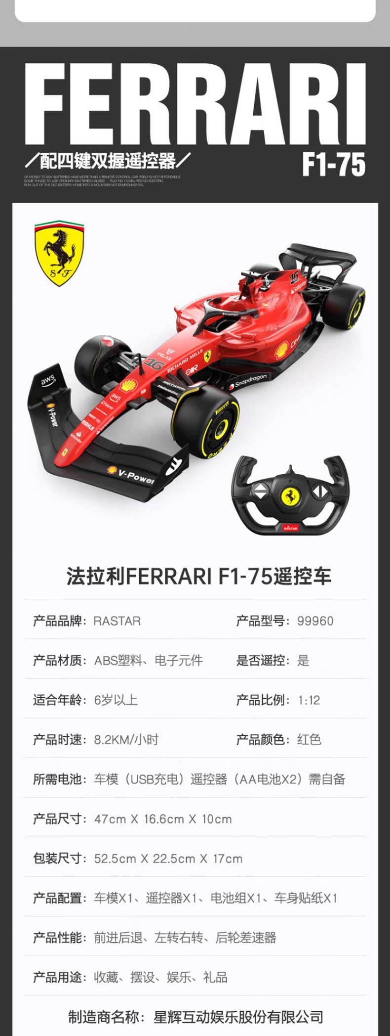 商品名称:rastar 1:12儿童遥控车玩具车法拉利F1-75 99960(单位:辆) 红色