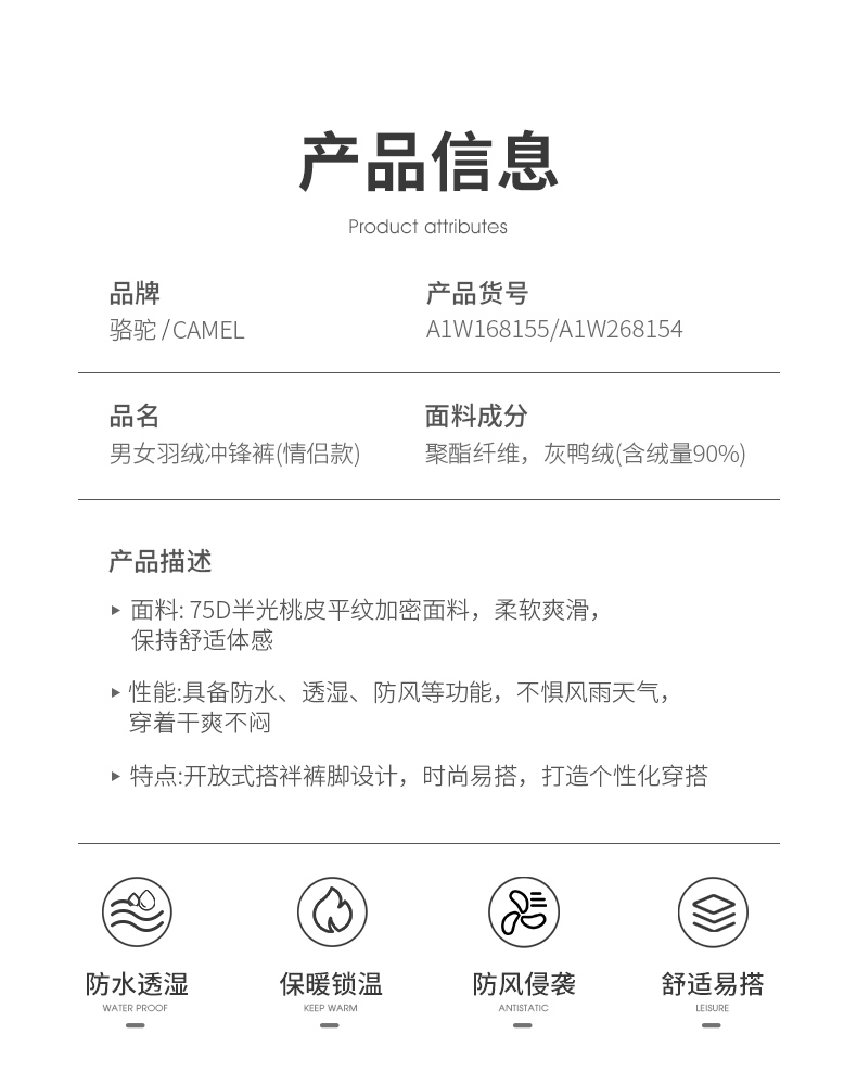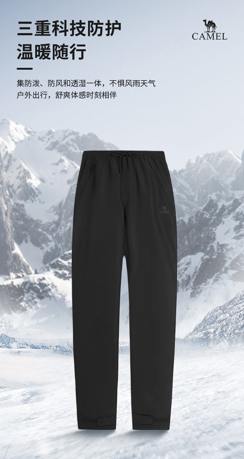 商品名称:骆驼羽绒冲锋裤男2023秋冬防风防水保暖加厚御寒户外登山滑雪工装长裤 A1W268154条 黑色 S