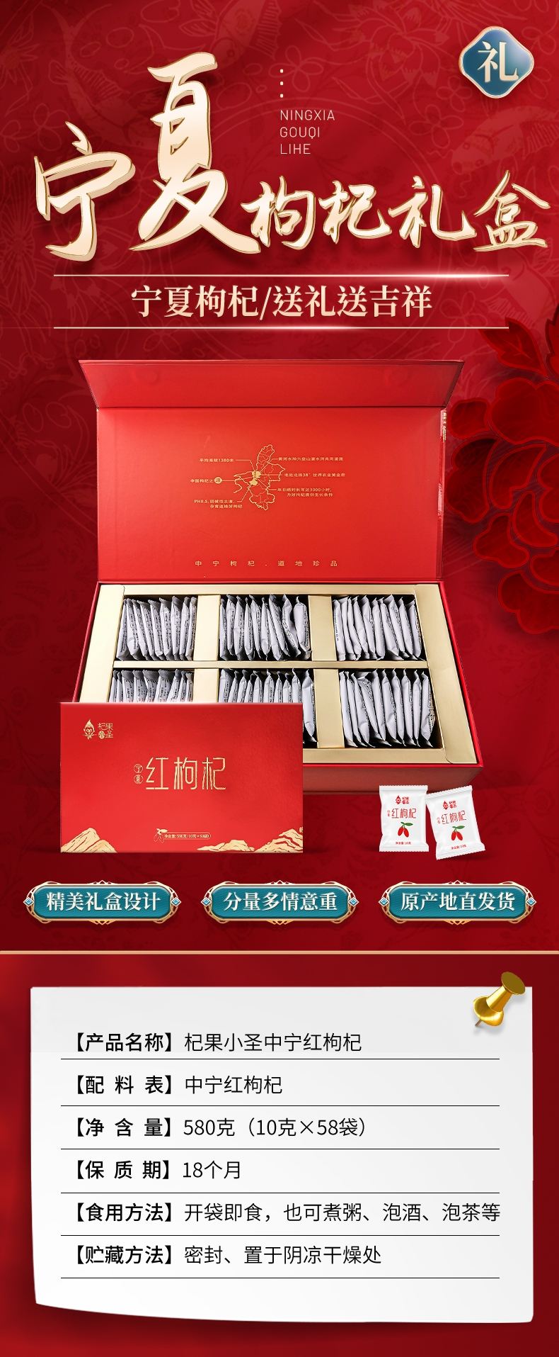 商品名称:杞果小圣红枸杞580克精品礼盒(58袋*10G) 红色