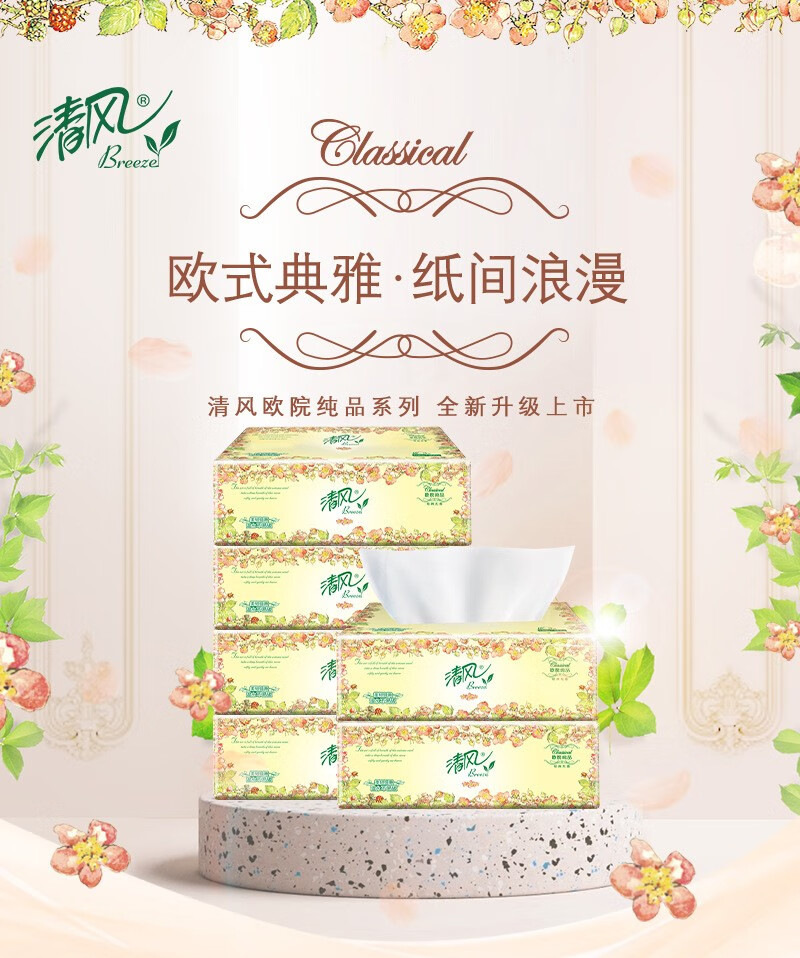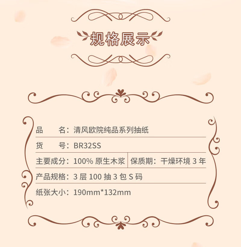 商品名称:清风欧院抽纸3层100抽3包 体验装BR12XSS-03E