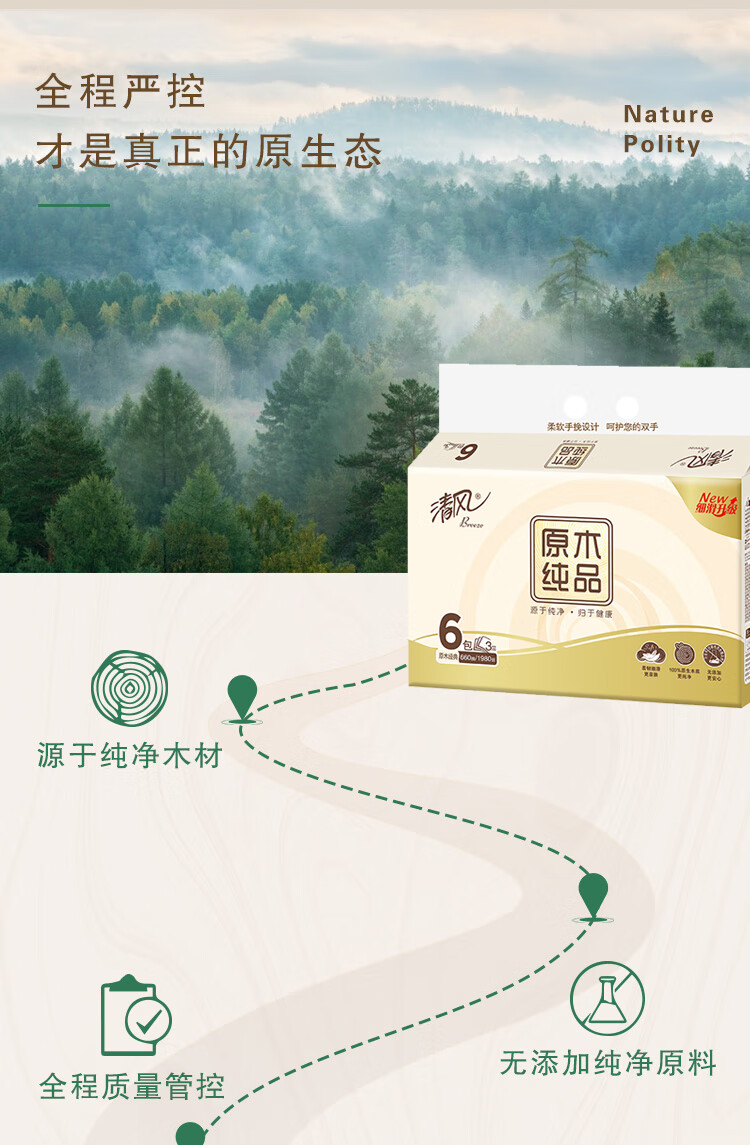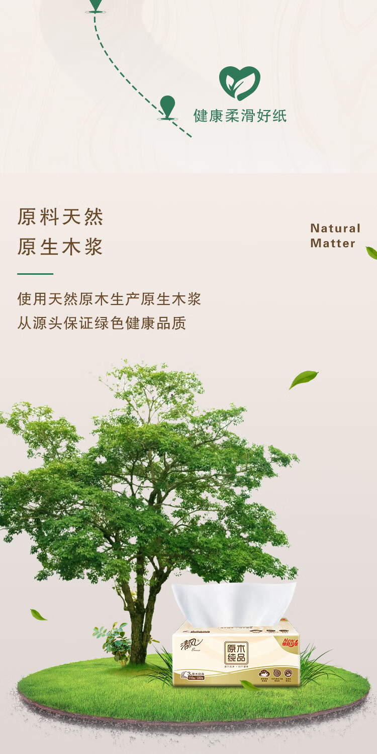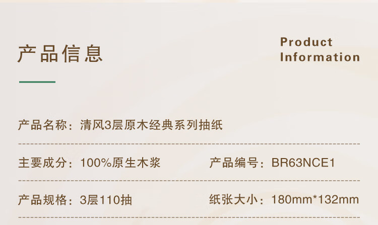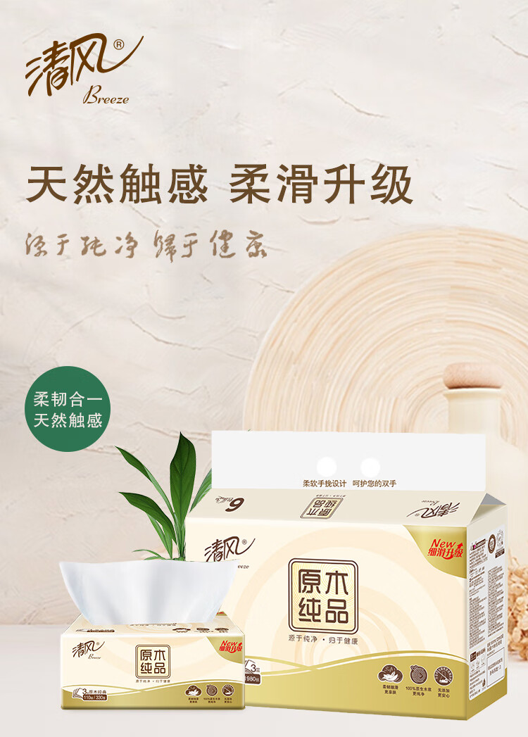 商品名称:清风原木纯品抽纸3层110抽6包2提装BR63NC-12E-T(单位:提)