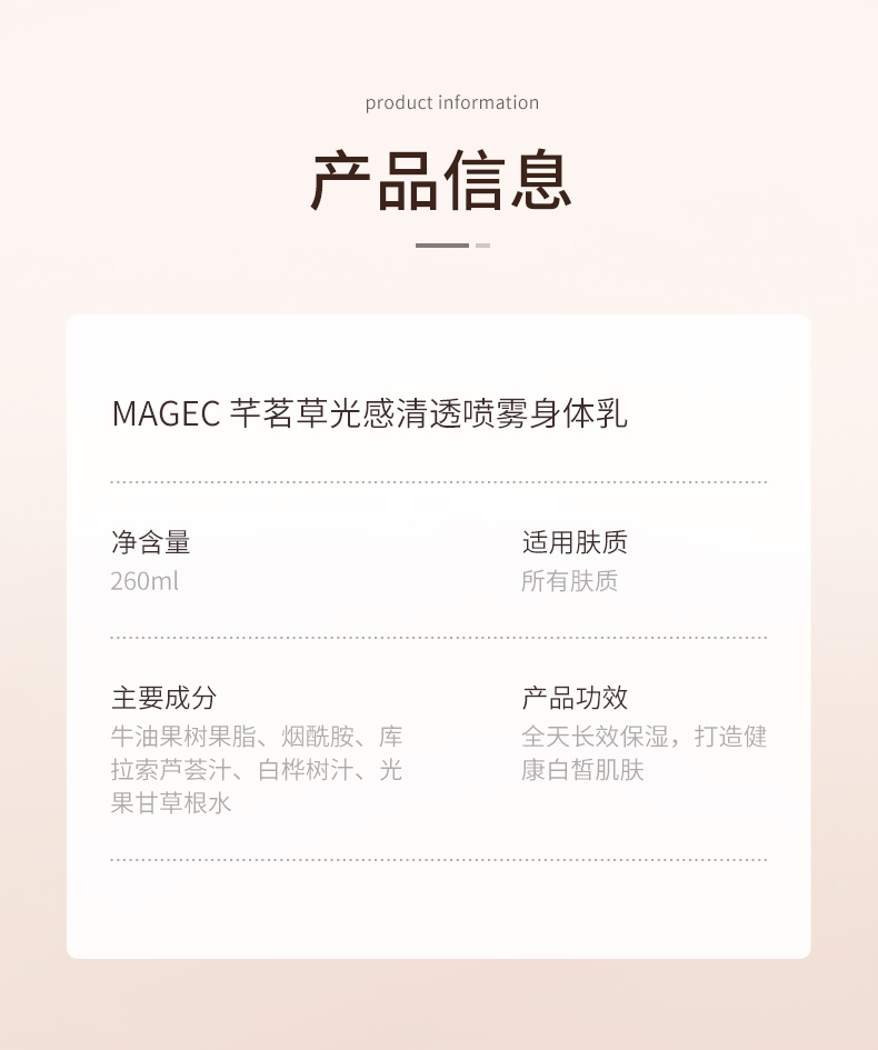 商品名称:MAGEC芊茗草 光感清透喷雾身体乳秋冬季男女士补水保湿留香润肤乳MQ120【260ml*2瓶】 拿铁色