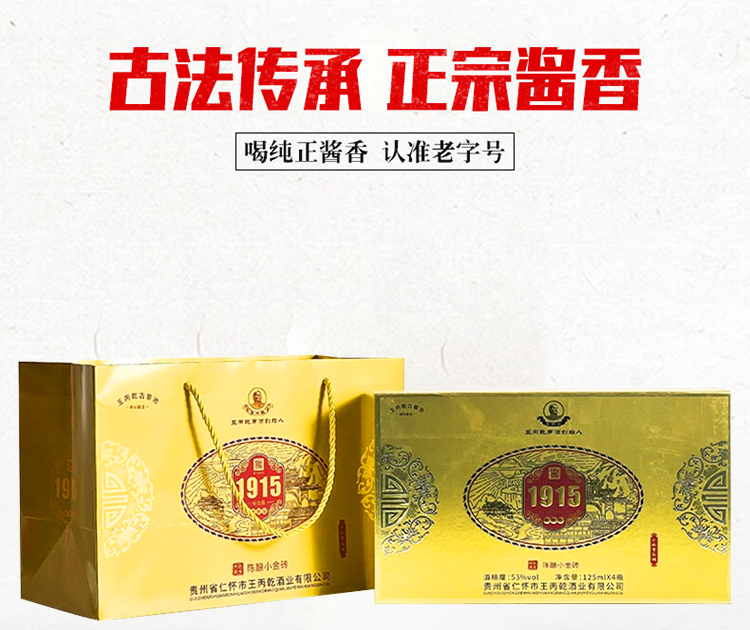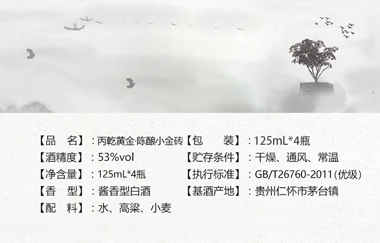 商品名称:丙乾黄金 陈酿小金砖 53度酱香型粮食白酒 礼盒装 125ml*4瓶