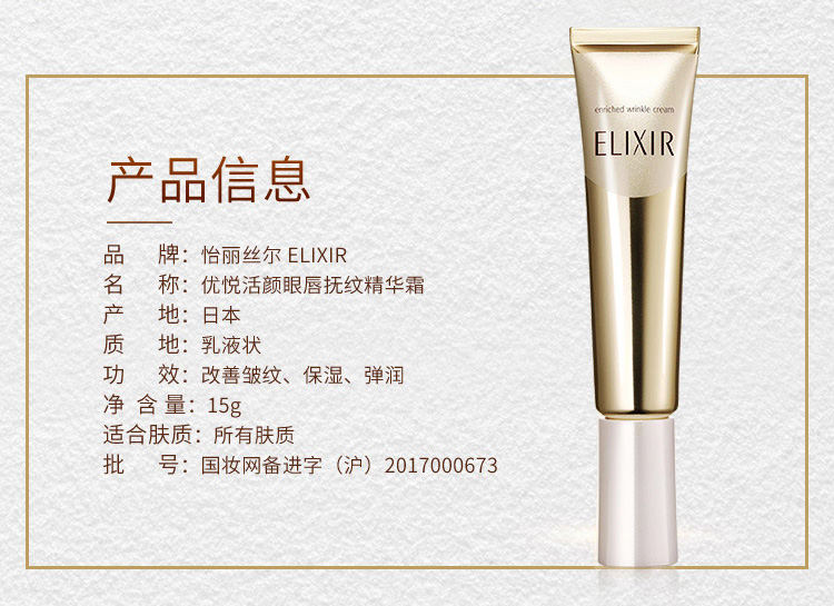 商品名称:资生堂怡丽丝尔优悦活颜眼唇抚纹精华霜15g 象牙色