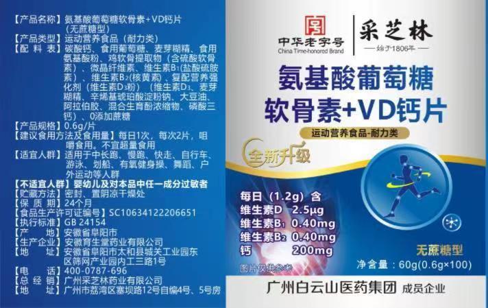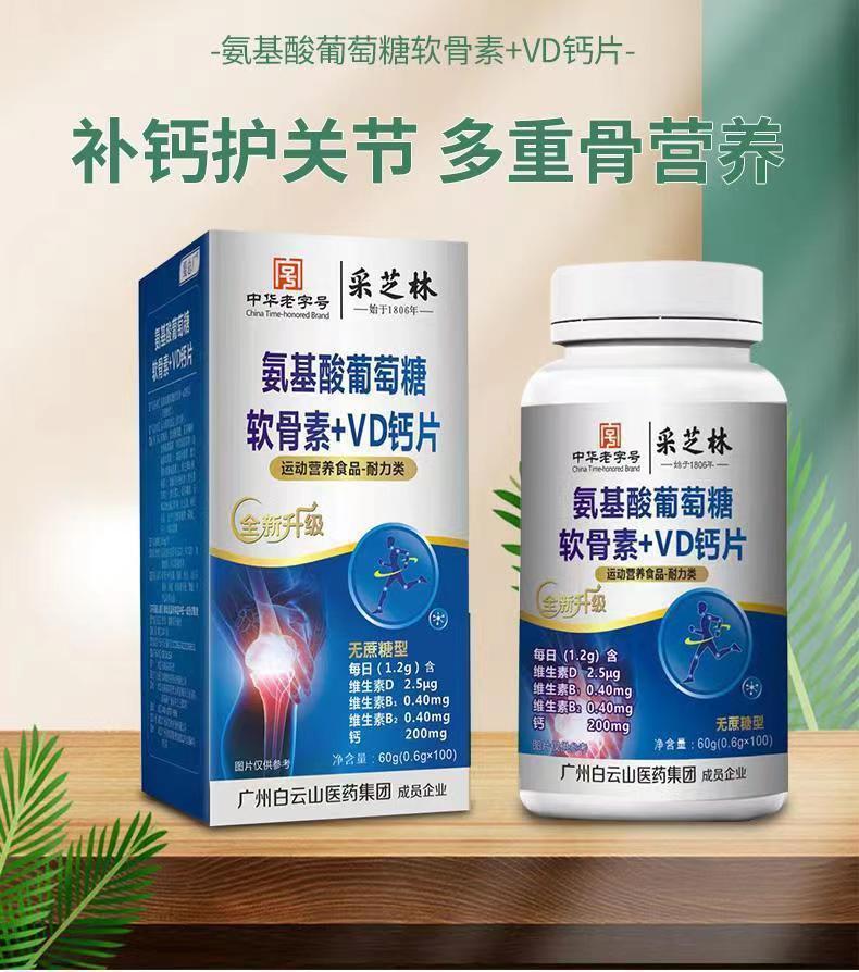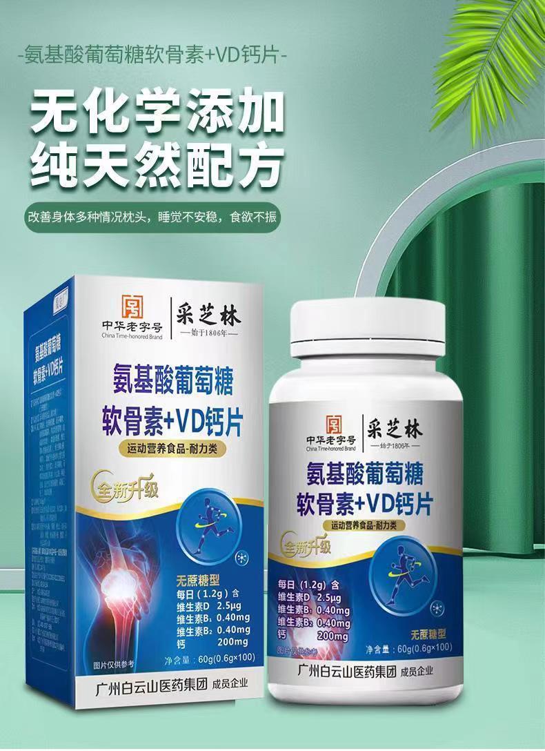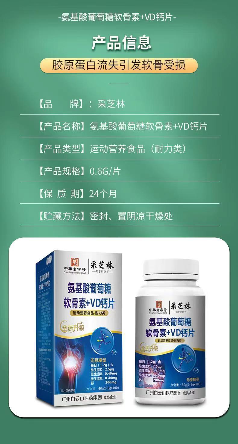 商品名称:白云山采芝林氨基酸葡萄糖软骨素+VD钙片60克/盒 1盒装【体验装】