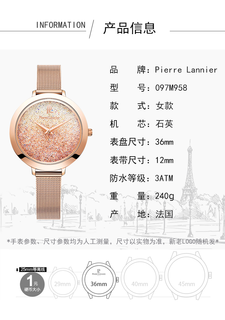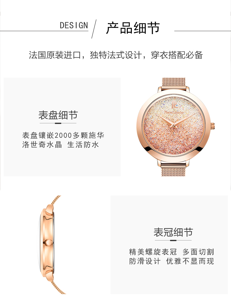 商品名称:连尼亚(Pierre Lannier)满天星石英手表女表36mm女友礼物097M958(单位:个) 粉色