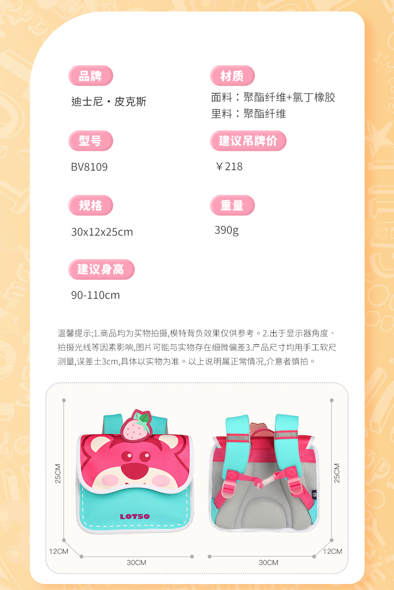 商品名称:迪士尼(Disney)迪士尼儿童幼儿园书包男女孩草莓熊双肩包轻便大容量宝宝可爱背包 草莓熊 BV81 粉色