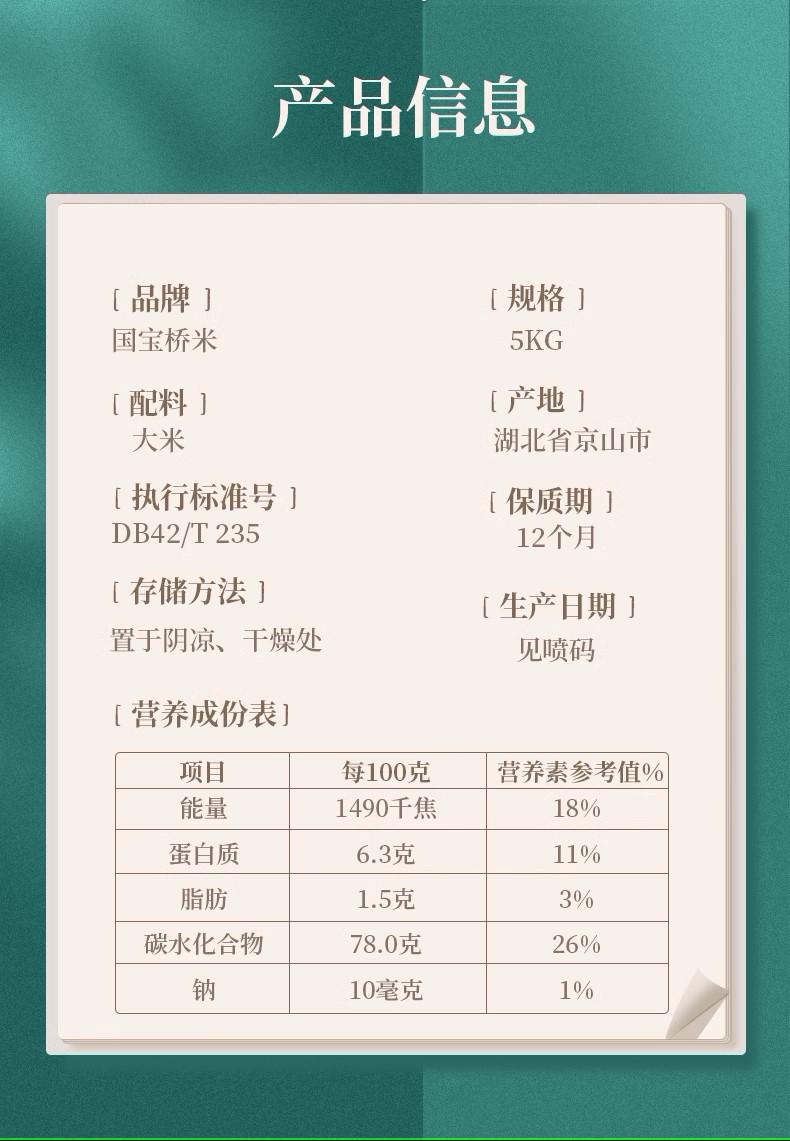 商品名称:国宝桥米优质大米贡米(真空两面体)5kg*1袋 琥珀色