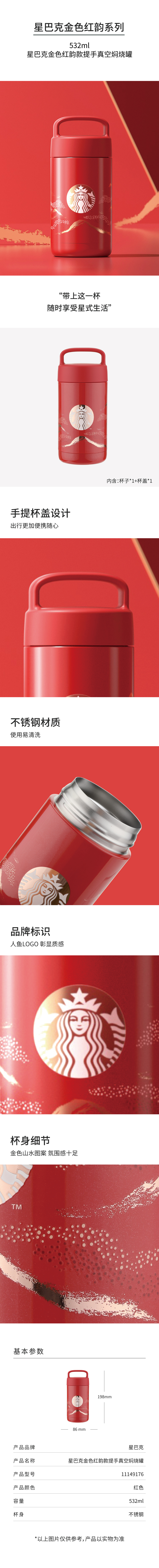 商品名称:星巴克金色红韵款提手真空焖烧罐532ml(单位:个) 红色