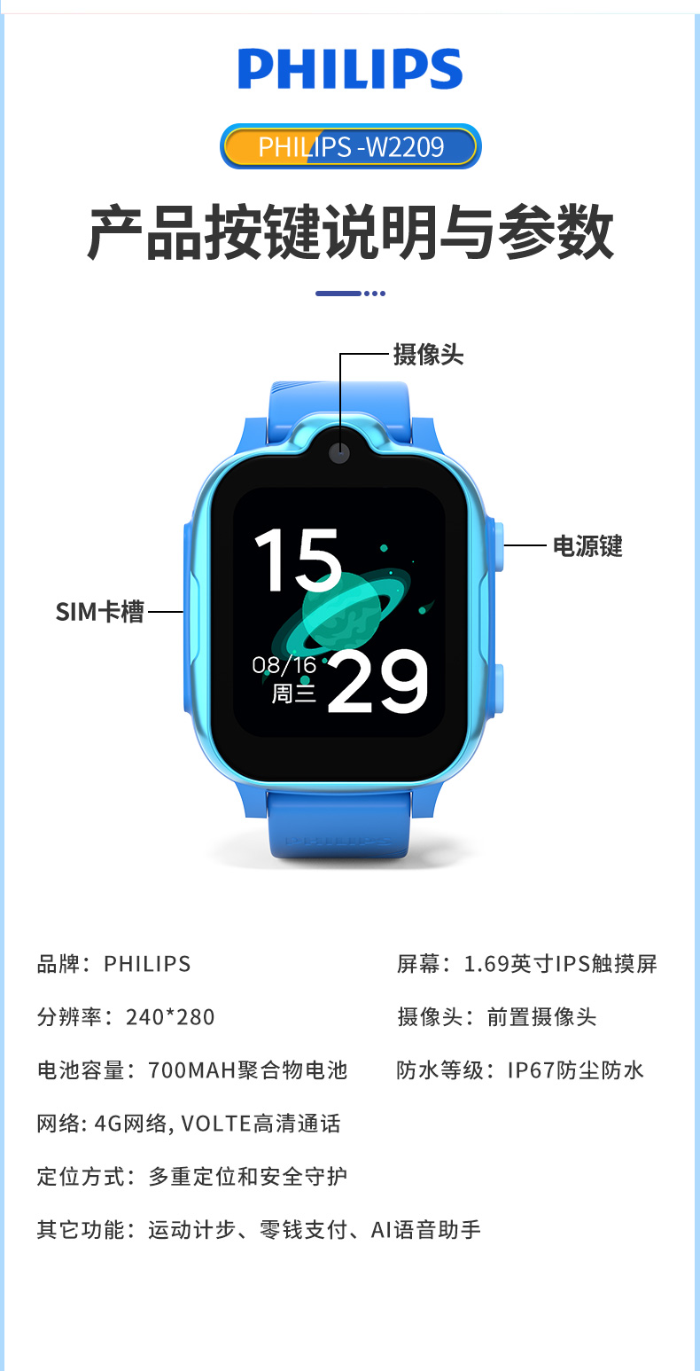 商品名称:飞利浦电话手表长续航智能儿童手表 W2209(单位:个) 黑色