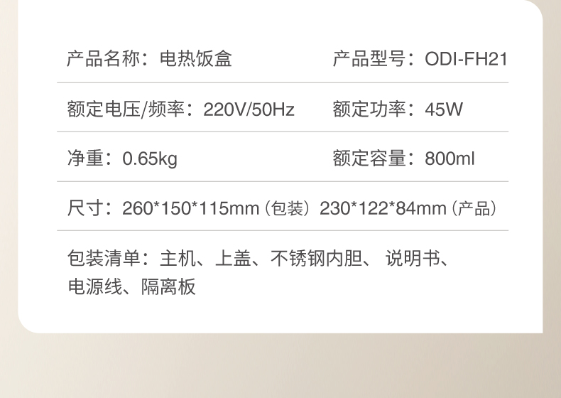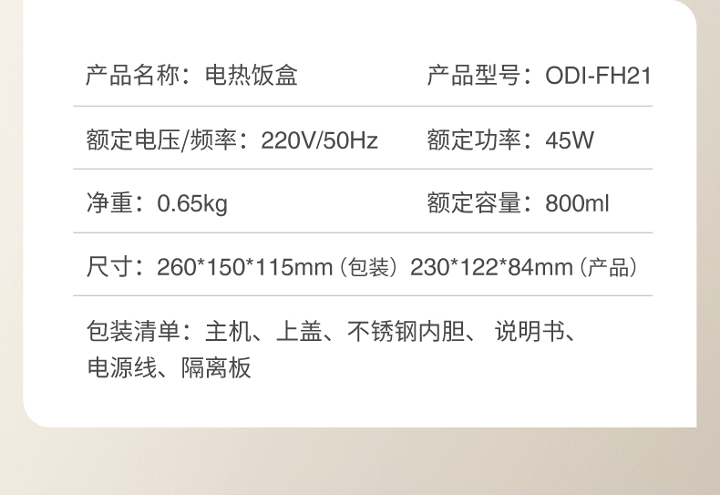 商品名称:OIDIRE加热电饭盒ODI-FH21免注水保温(单位:台) 布鲁白