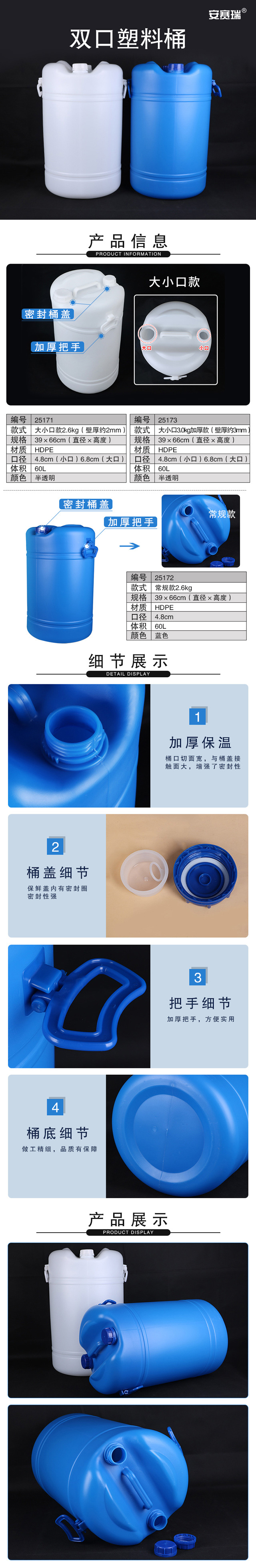 商品名称:安赛瑞 双口塑料桶 60L 加厚化工桶汽柴油桶清洗剂桶 化工洗涤剂桶 密封水桶 大小口化工桶 半透明 25173 个 无色