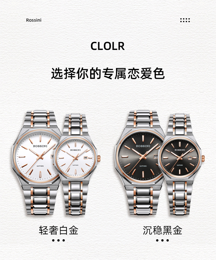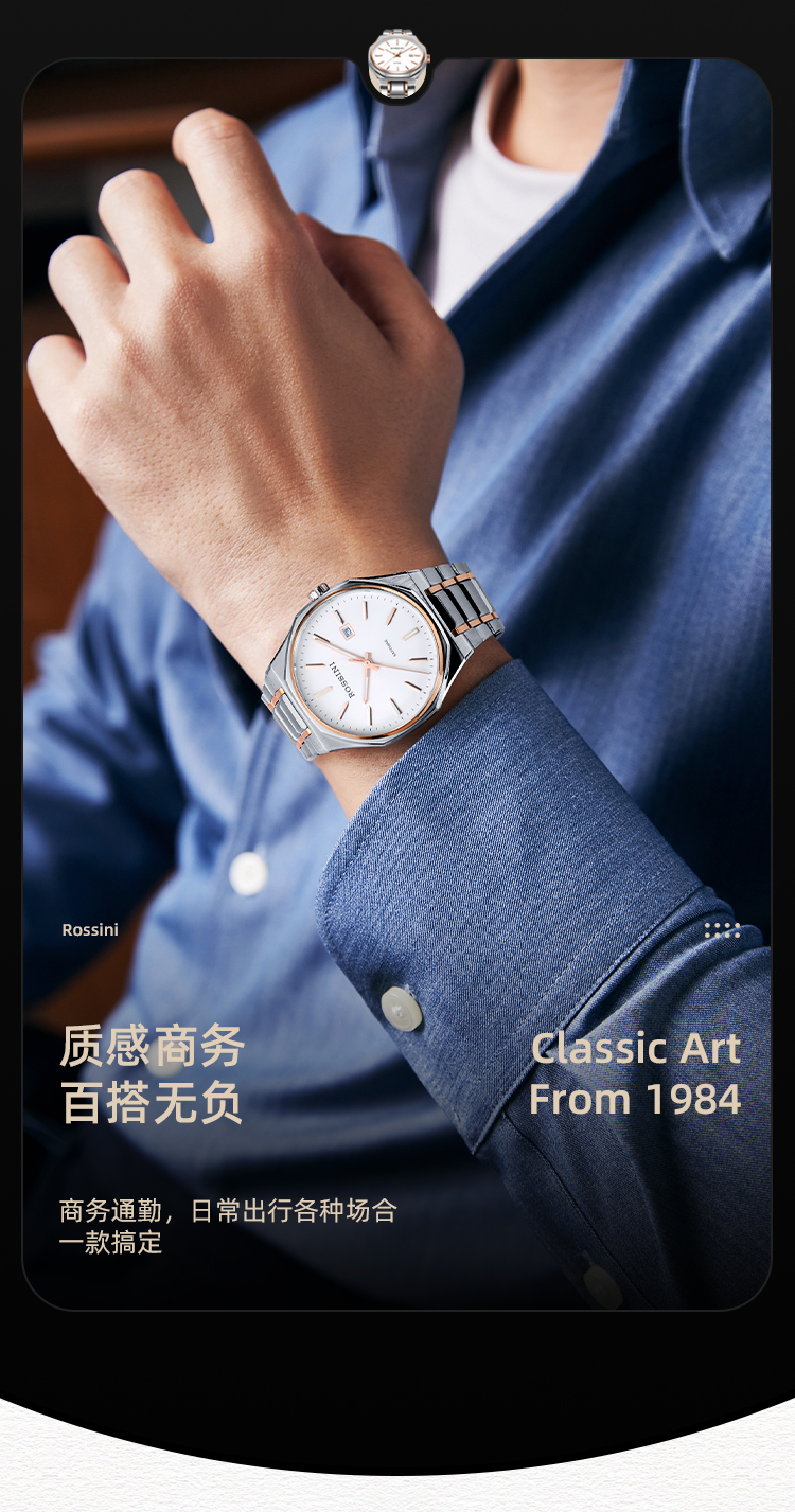 商品名称:Rossini罗西尼 启迪系列 石英手表时尚商务情侣款黑盘男表50103T03B(单位:块) 黑色