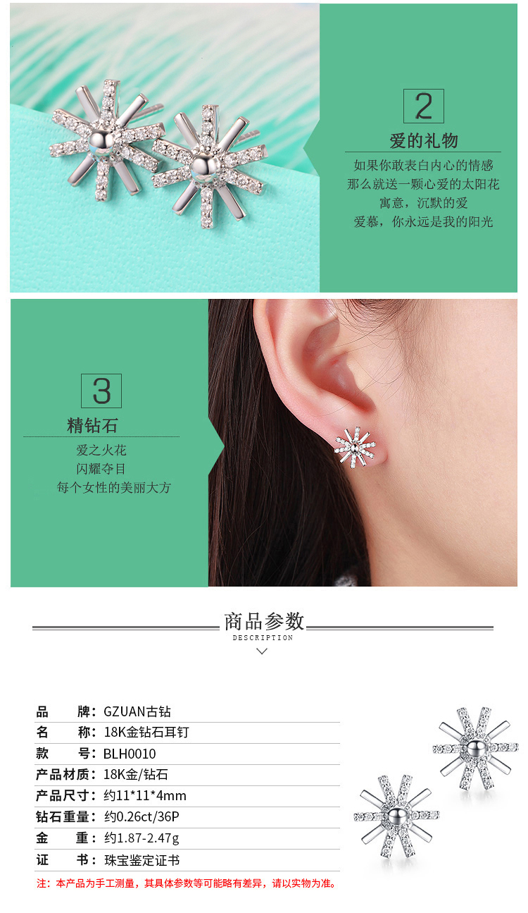 商品名称:GZUAN古钻珠宝 星空 18K金钻石女士耳钉耳饰 BLH0010(单位:件) 银色