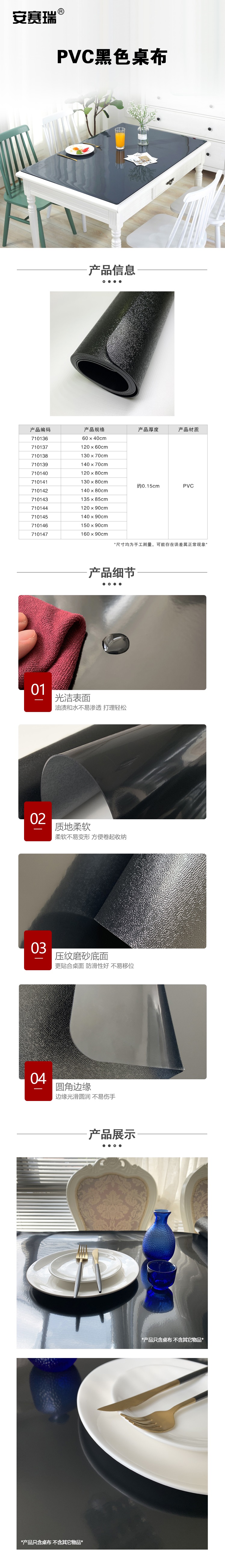 商品名称:安赛瑞 PVC桌布 不透明黑色磨砂PVC软玻璃桌布 140×90cm 防油防水长方形塑料台布 圆角 710145 个 曜石黑
