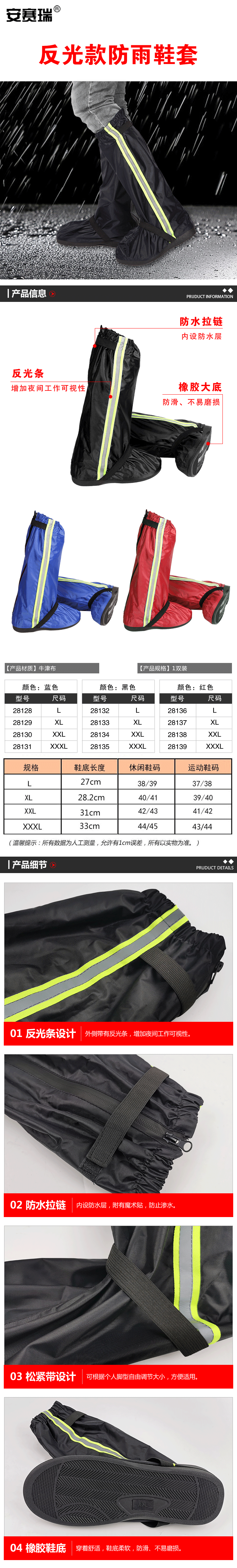 商品名称:安赛瑞 反光款防雨鞋套 便携式防水防雨耐磨高筒牛津布脚套XXXL码44码至45码 28139 双 红色