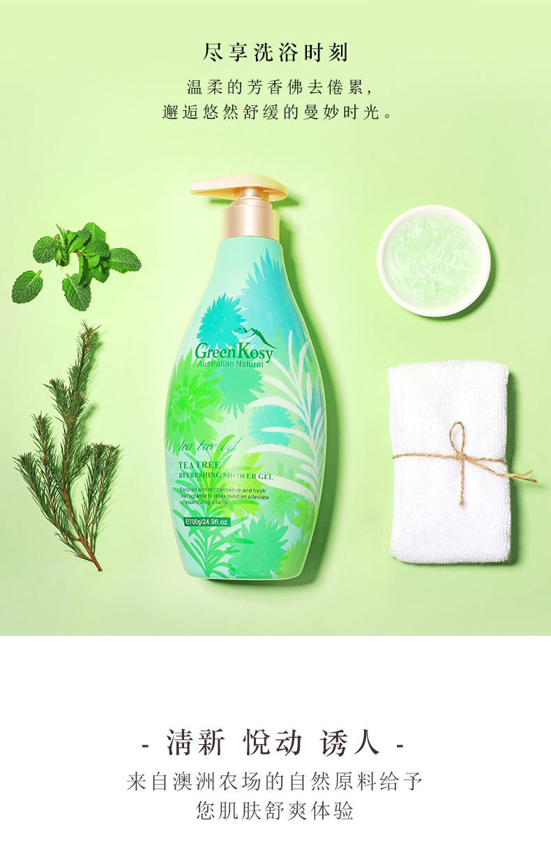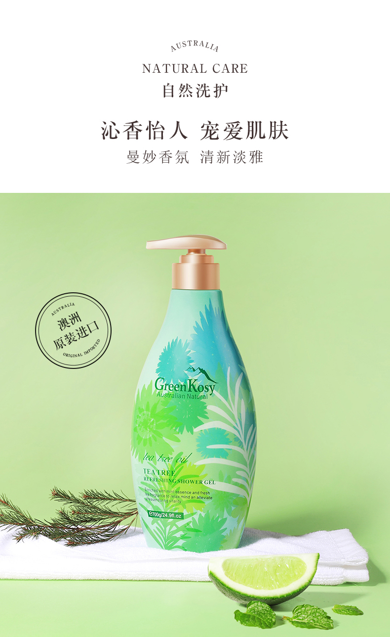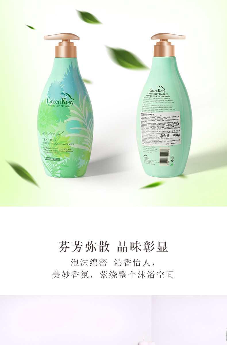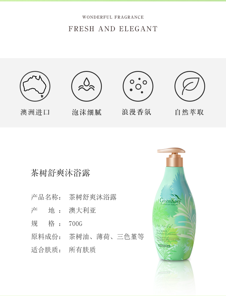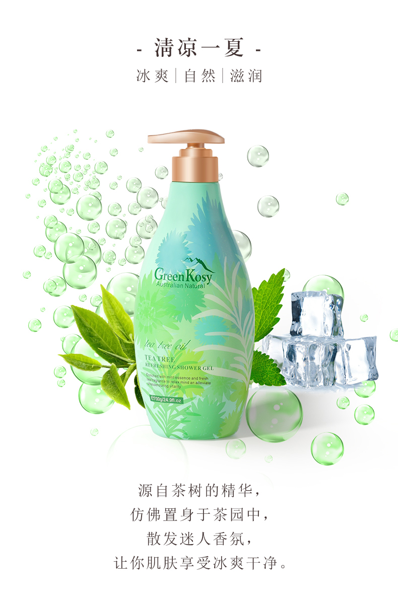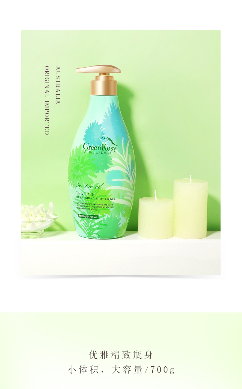 商品名称:绿色溪谷茶树舒爽沐浴露700g 瓶 雾雨绿
