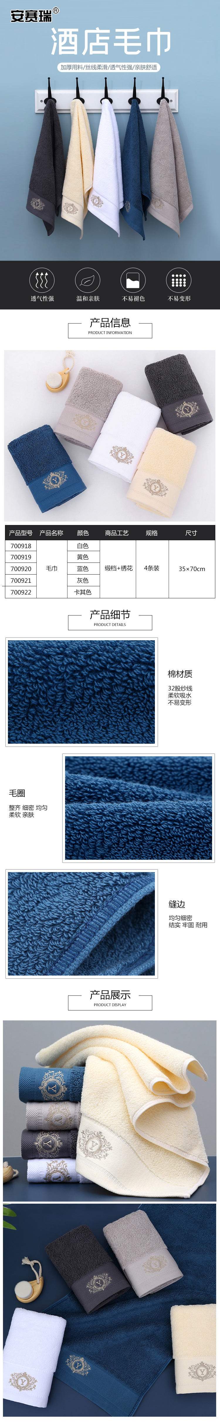 商品名称:安赛瑞 毛巾 吸水洗脸擦汗加厚面巾 酒店餐厅清洁擦拭巾 4条装宽35cm长75cm 白色 700918 4条装 白色