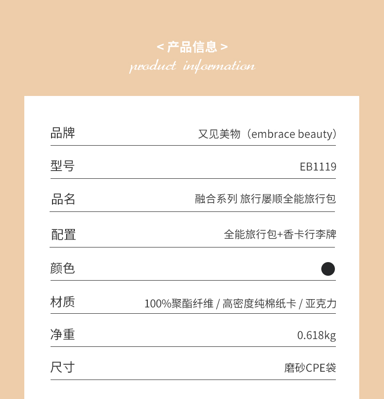 商品名称:又见美物初遇系列初遇全能旅行包EB1119单位:个 黑色