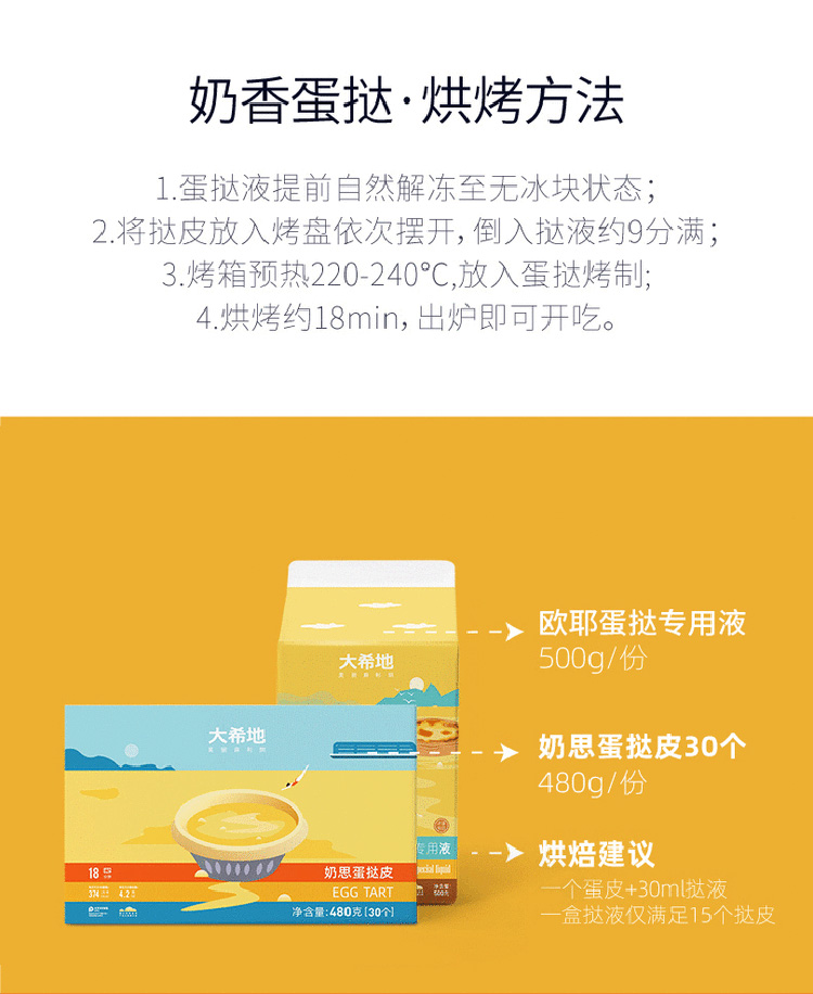 商品名称:【大希地】葡式自制蛋挞烘焙原料 蛋挞液500g一盒+蛋挞皮30个