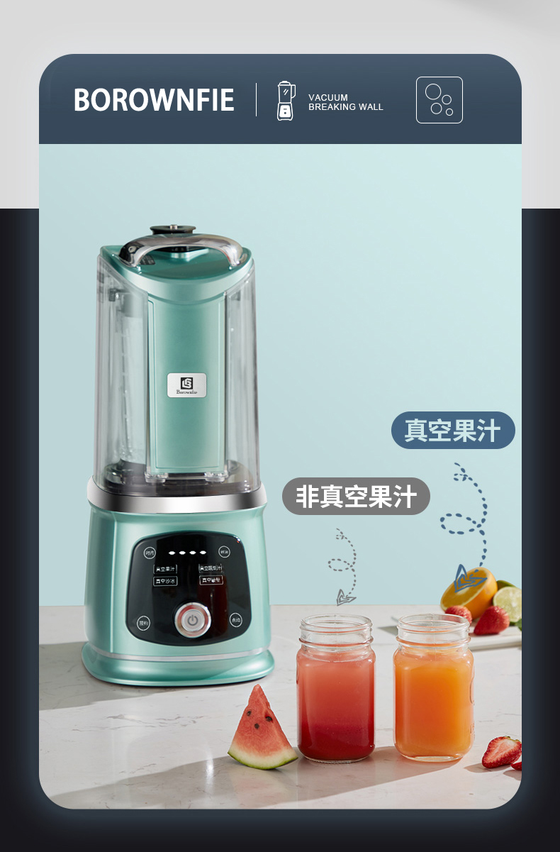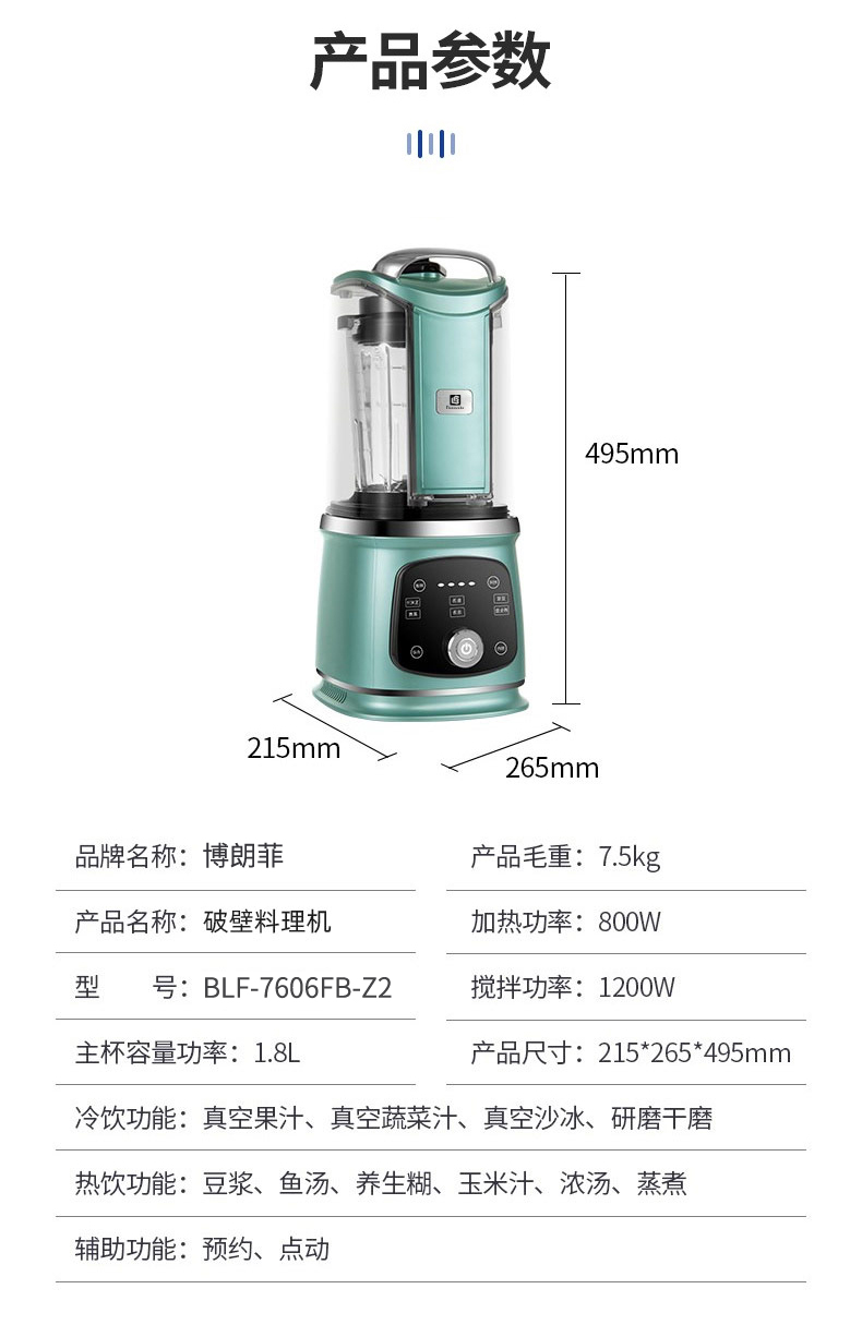 商品名称:博朗菲(Borownfie) 轻静音真空破壁机 1.8L BLF-7606FB-Z2 绿色