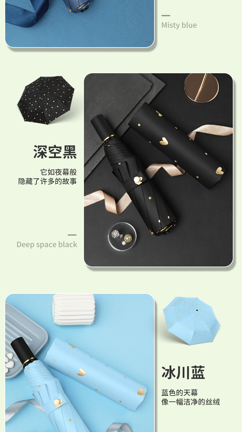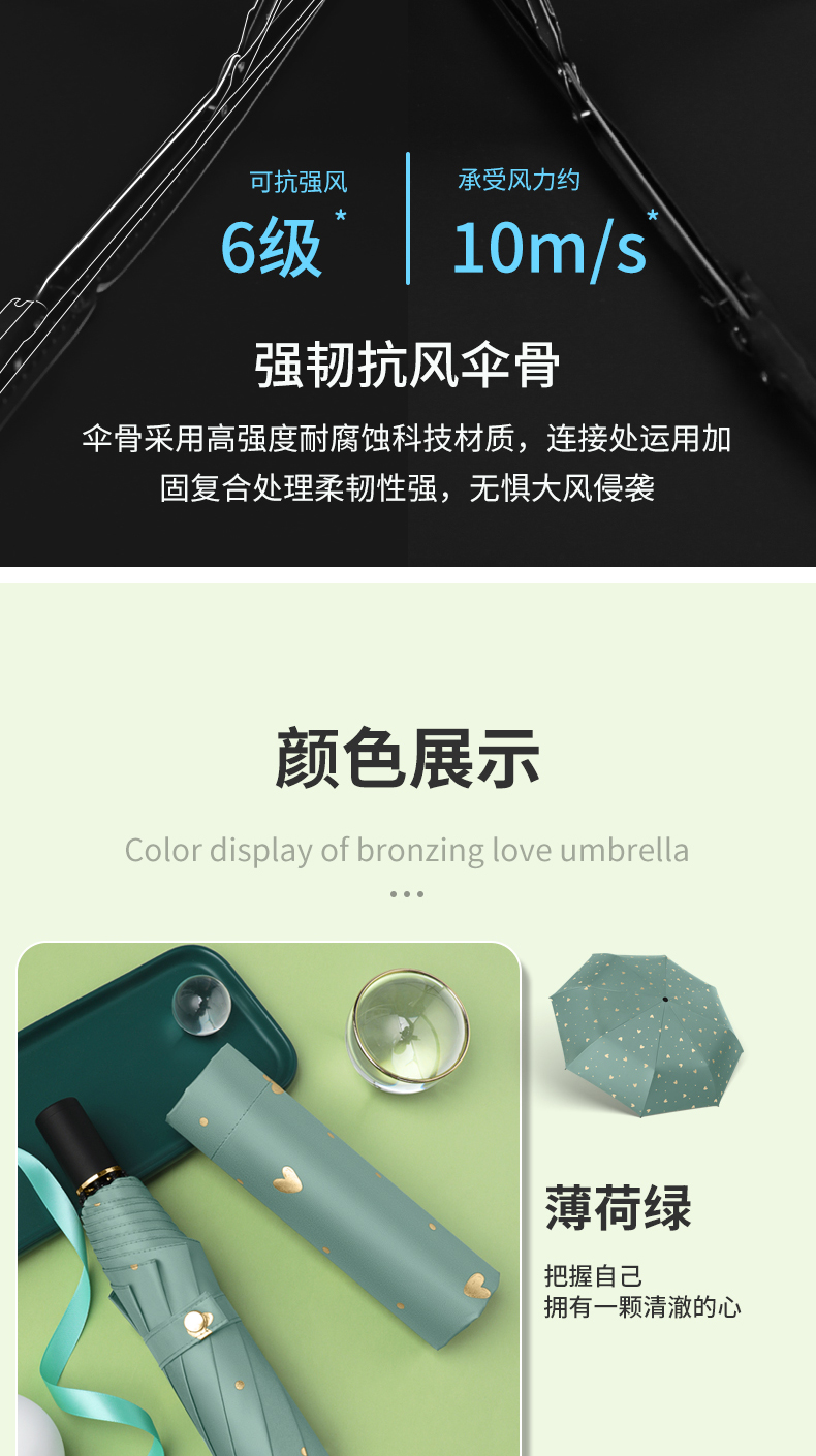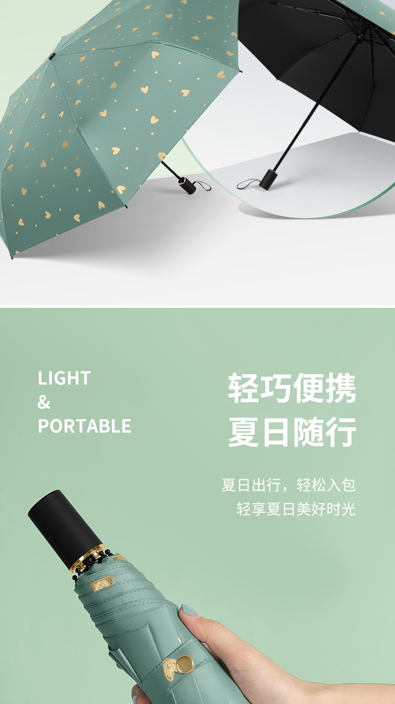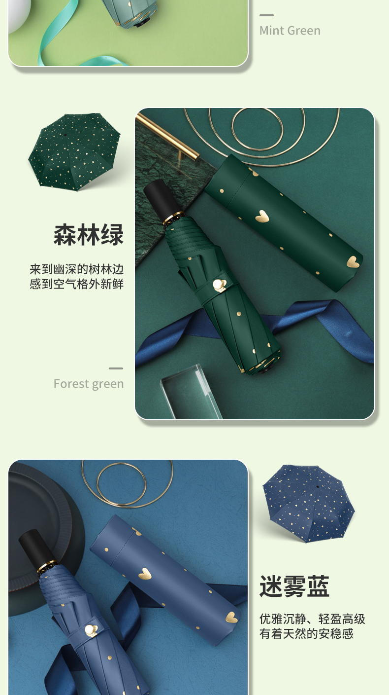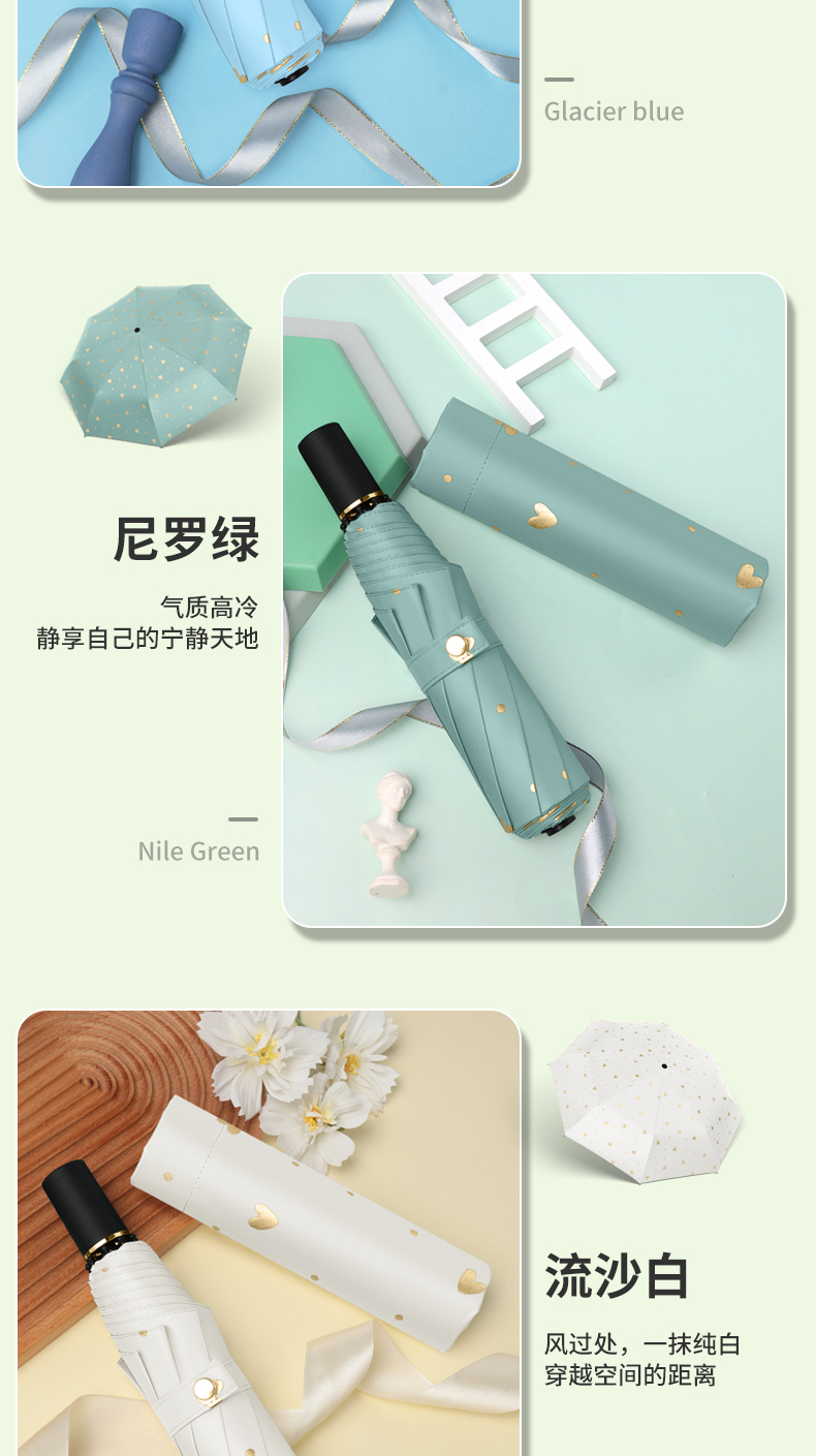 商品名称:美度ins烫金爱心遮阳伞女森系折叠晴雨伞三折伞M3101 56cm*8k/98cm(单位:把) 薄荷绿