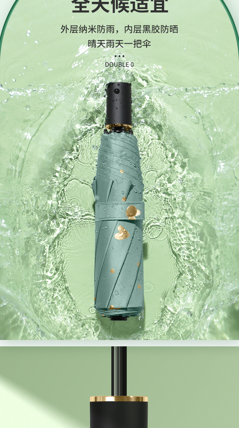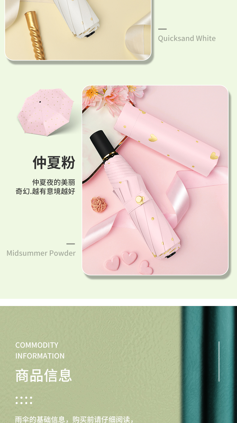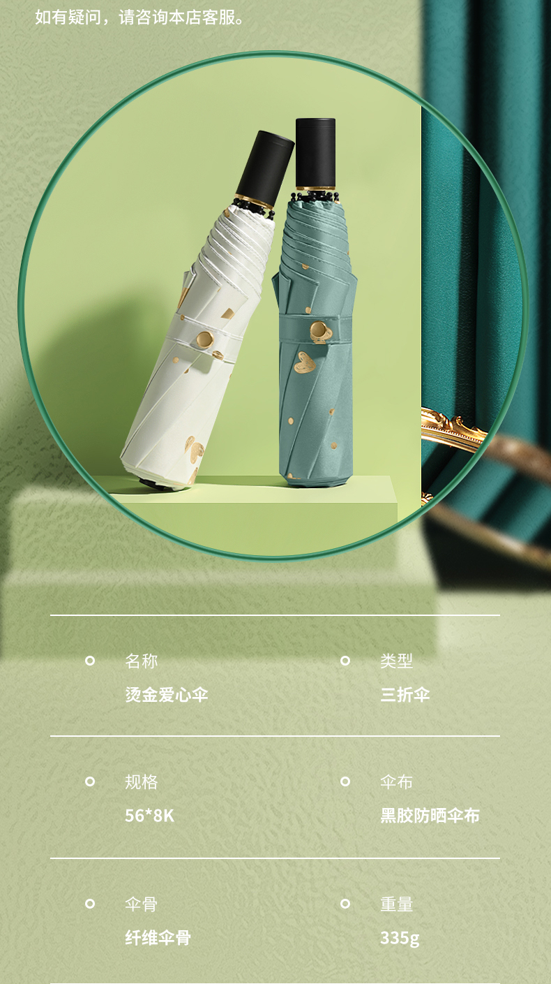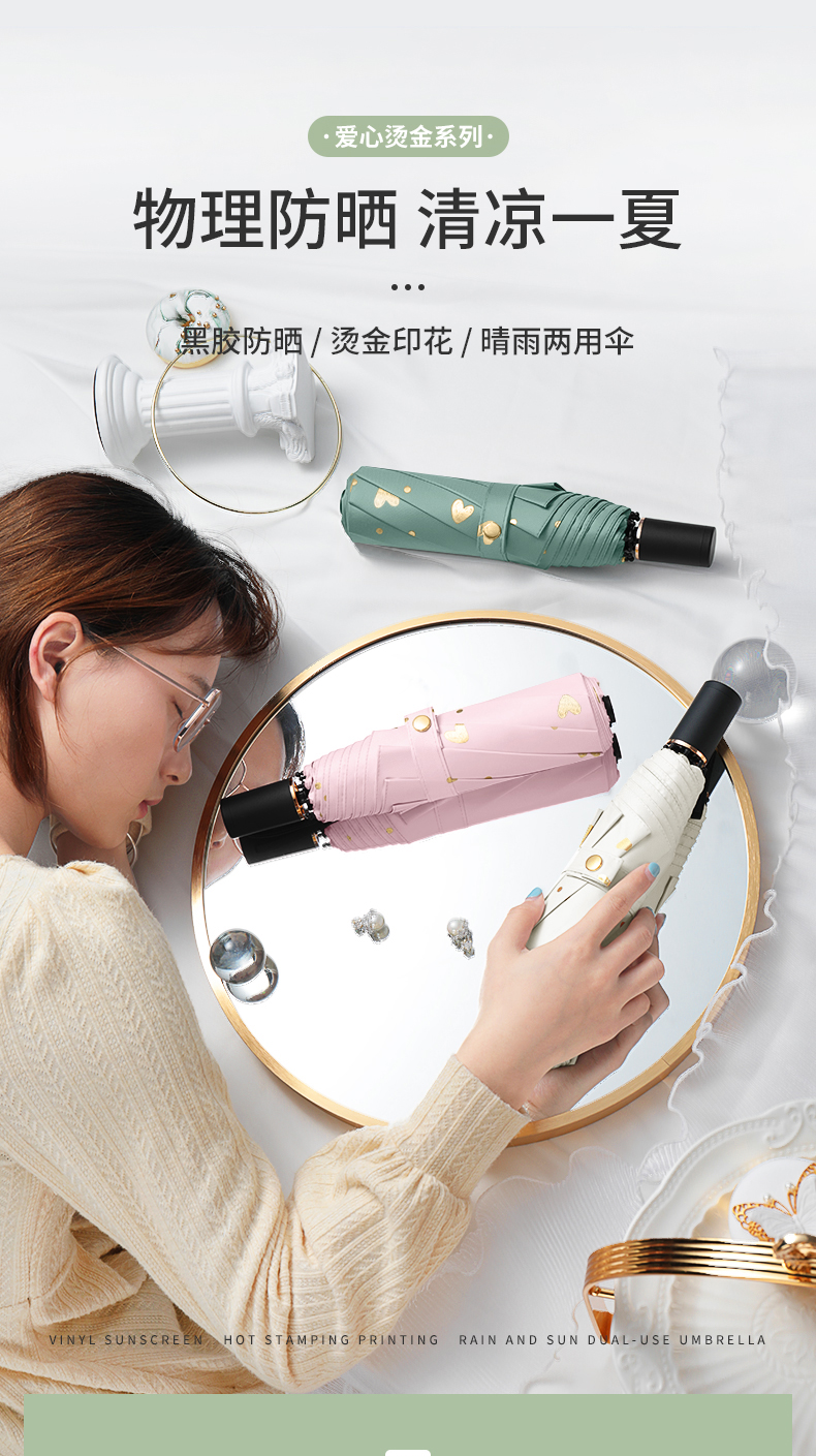 商品名称:美度ins烫金爱心遮阳伞女森系折叠晴雨伞三折伞M3101 56cm*8k/98cm(单位:把) 薄荷绿